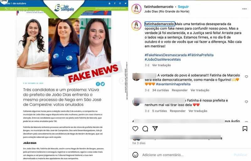 No último sábado, o blog Jair Sampaio chegou a cogitar a informação, em primeira-mão, sendo o primeiro veículo de notícias do Rio Grande do Norte a investigar a situação de Fatinha, logo a ainda candidata emitiu um comunicado dizendo que o blog Jair Sampaio estava noticiando fake news.