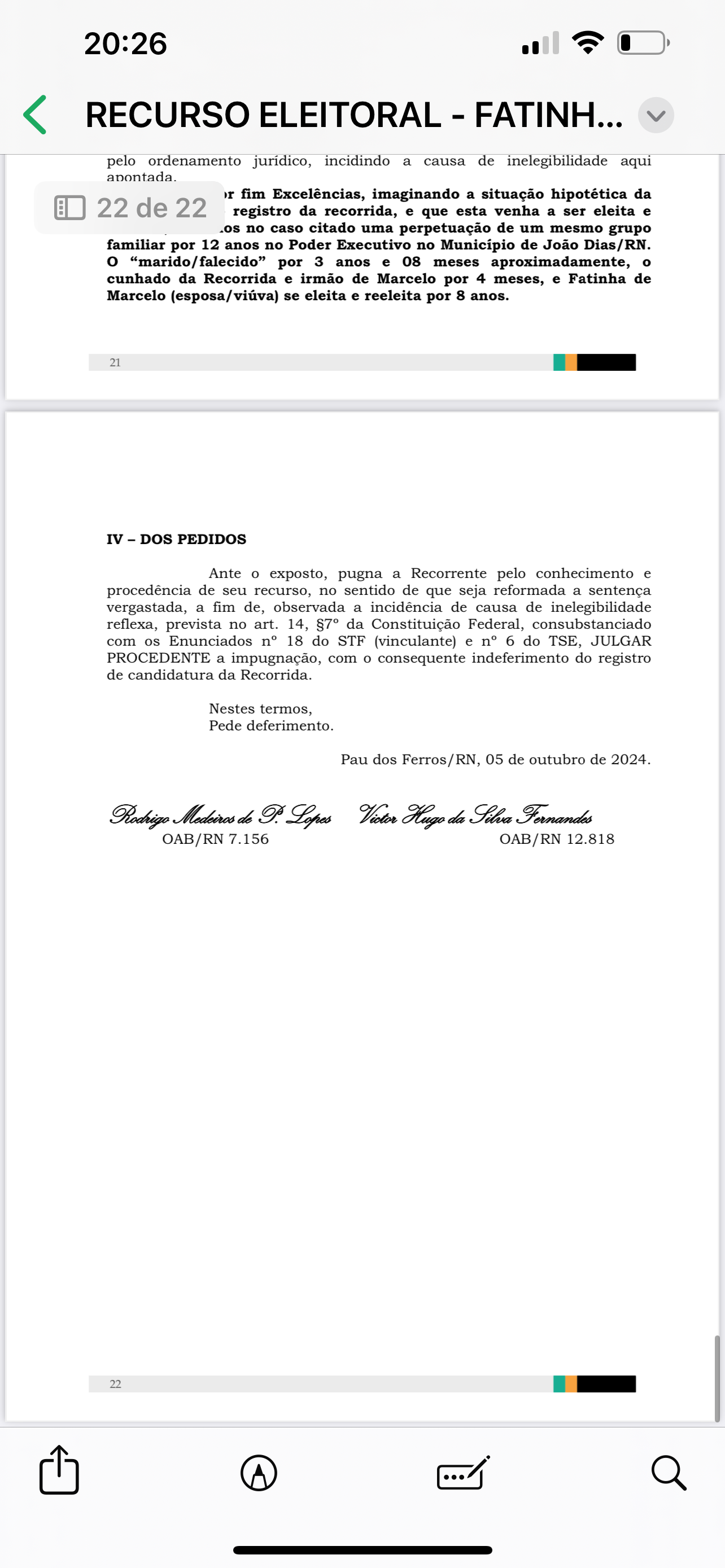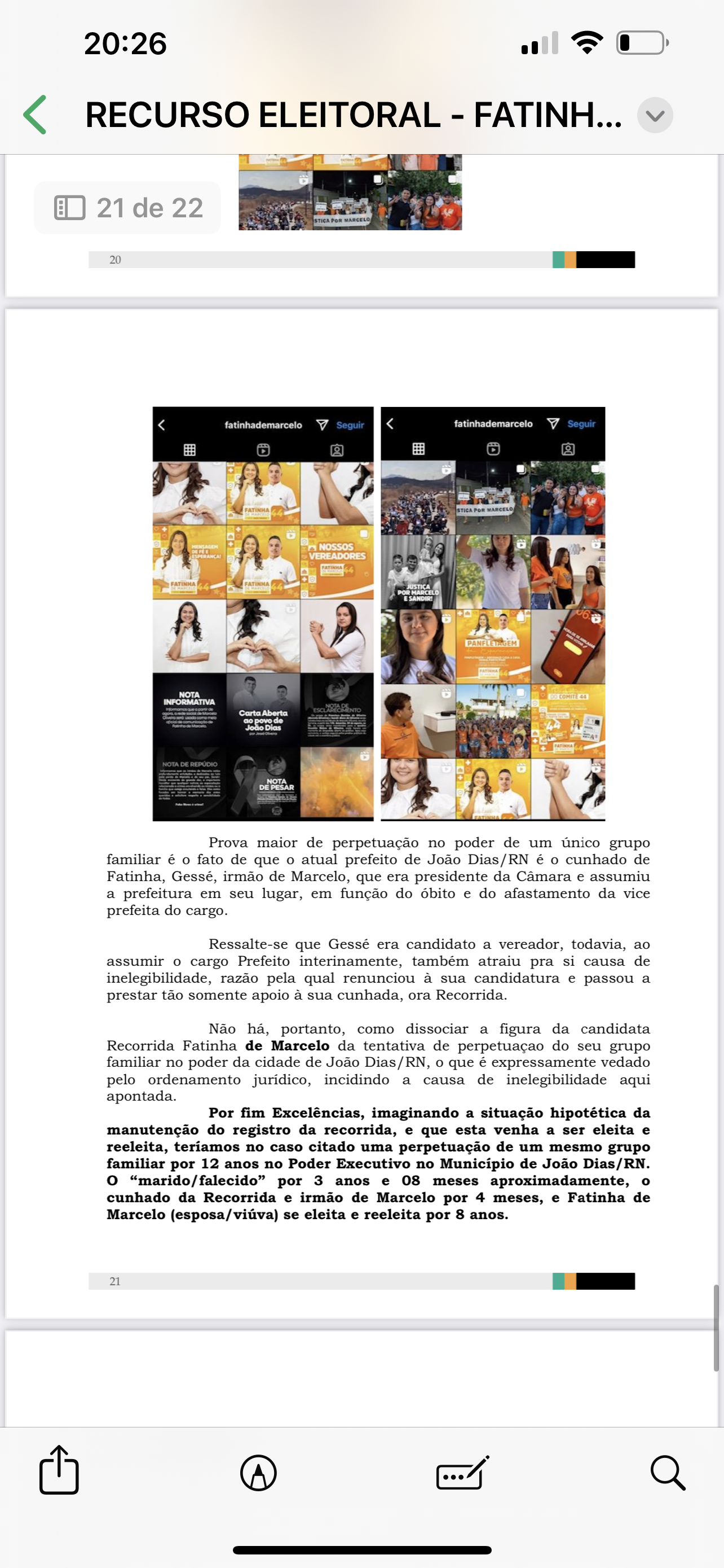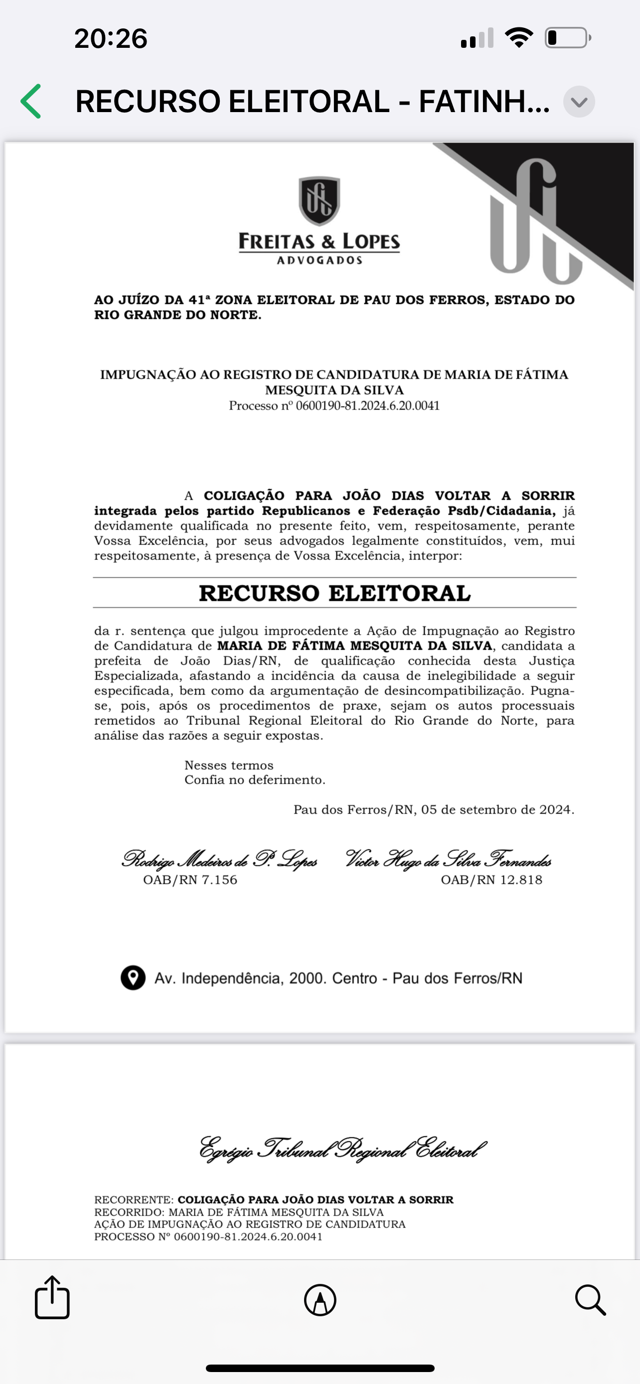 No caso da candidata Fatinha de Marcelo, que teve seu registro deferido pelo Juiz eleitoral de Alexandria, encontra-se pendente de apreciação de recurso eleitoral perante o Tribunal Regional Eleitoral do RN, que decidirá o futuro da eleição de João Dias.