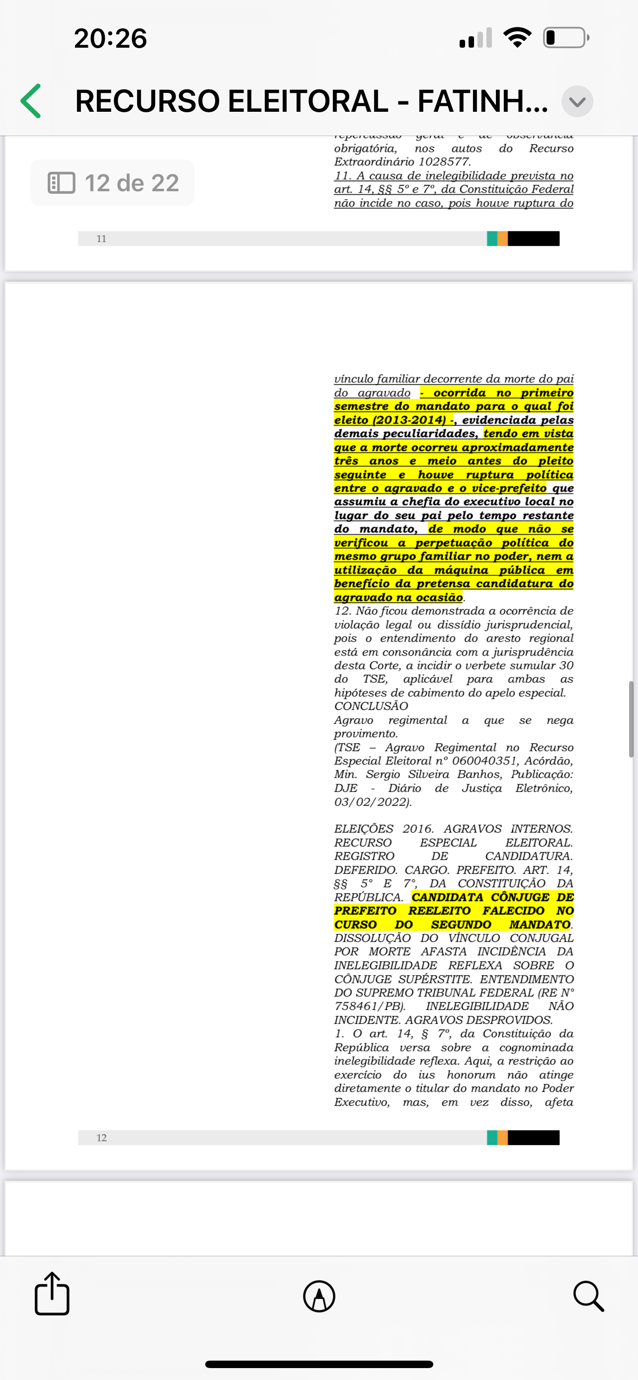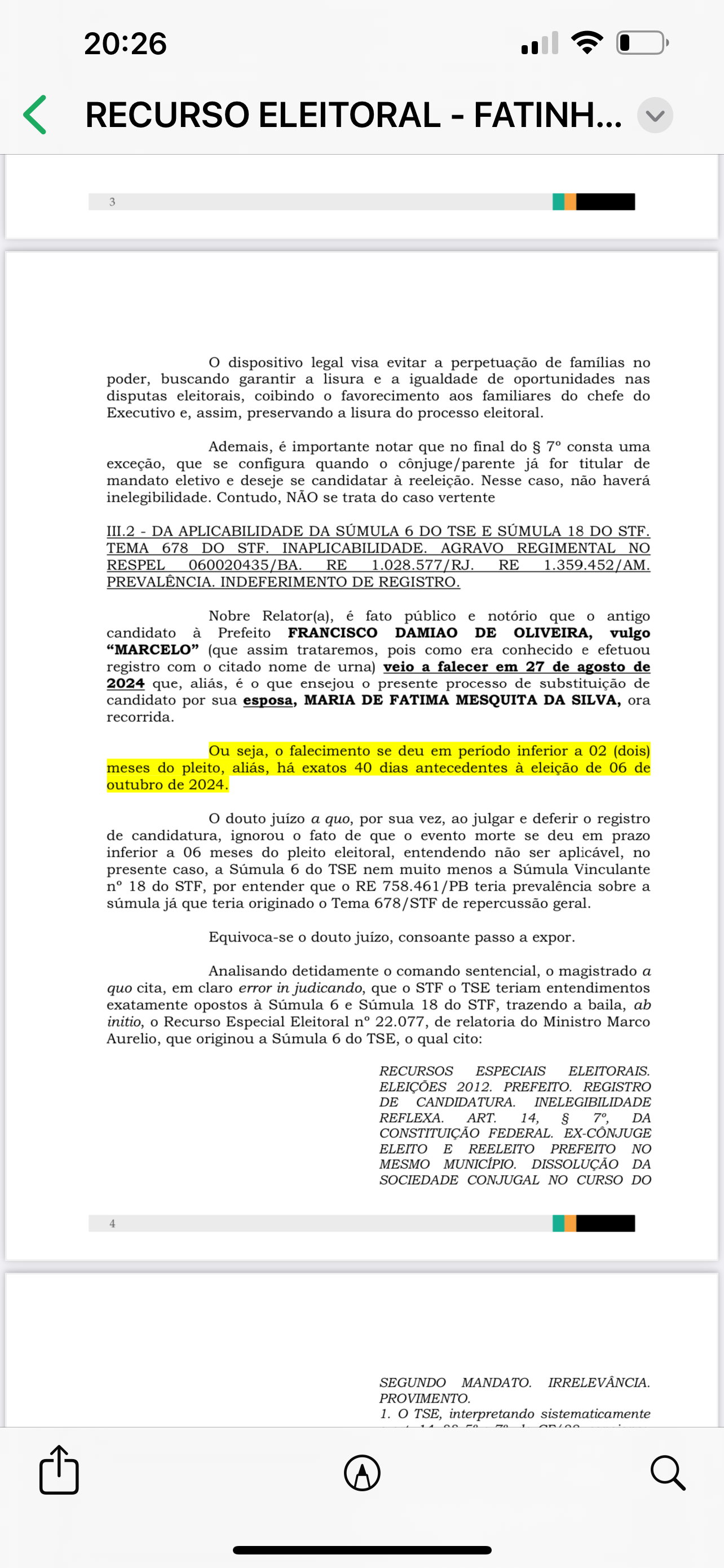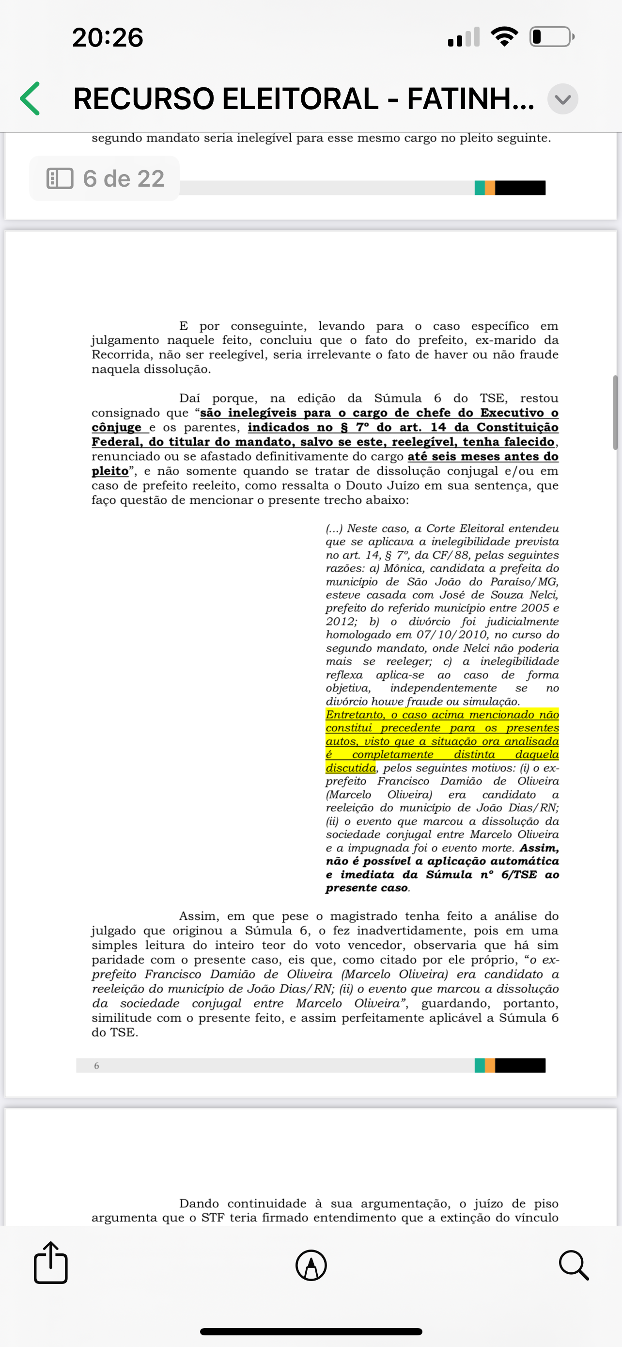 O TSE, por sua vez, no mesmo sentido, editou a Súmula n 6, que assim dispõe “São inelegíveis para o cargo de chefe do Executivo o cônjuge e os parentes, indicados no § 7º do art. 14 da Constituição Federal, do titular do mandato, salvo se este, reelegível, tenha falecido, renunciado ou se afastado definitivamente do cargo até seis meses antes do pleito”. Então, vemos que as cortes suprema do país, ambas, entendem pela inelegibilidade da candidata que, em função disso, não poderia concorrer ao pleito. Vale ressaltar que o TRE/RN começou a julgar no último dia 02 o registro de candidata da “Nega de Neném Borges”, onde em situação semelhante, concorreu usando o nome de urna em referência ao esposo falecido, tendo este ocorrido no ano de 2023.