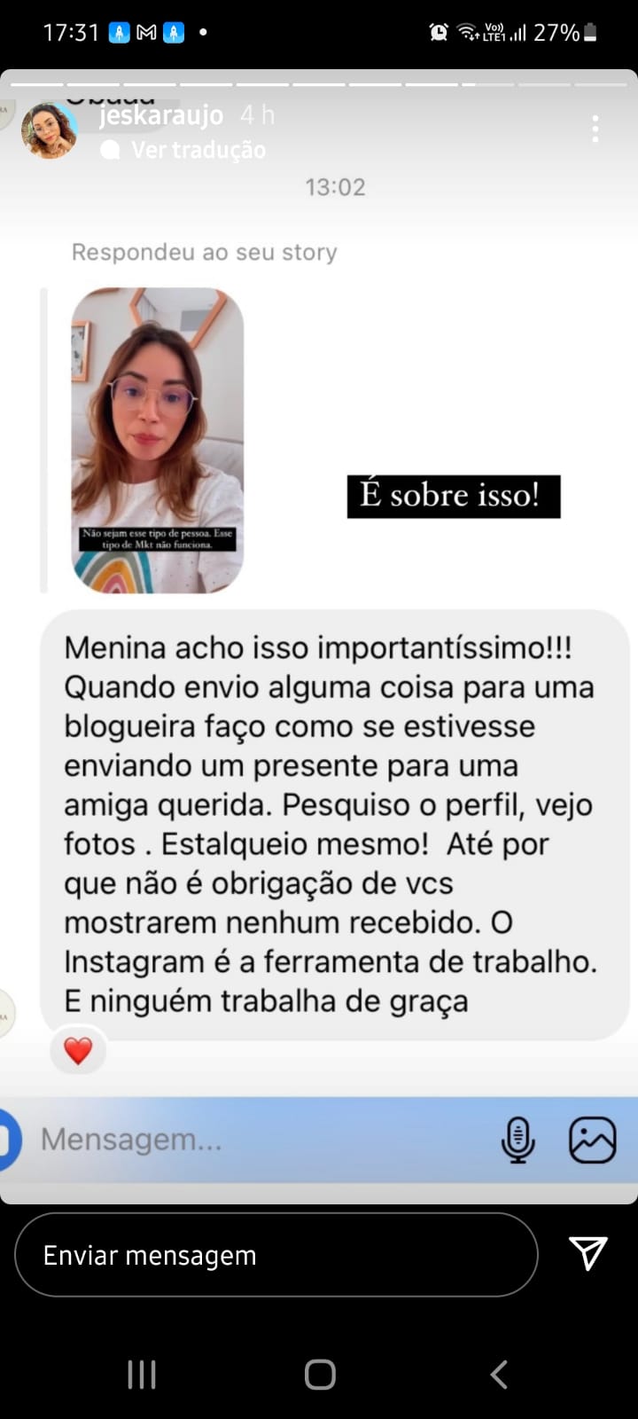 “Era bom que esse vídeo virasse polêmica pra ela se tocar. Imagine essa pessoa que mandou o recebido, como deve estar se sentindo? Que horror!!!”, diz uma das mensagens que reagem à fala da influencer.