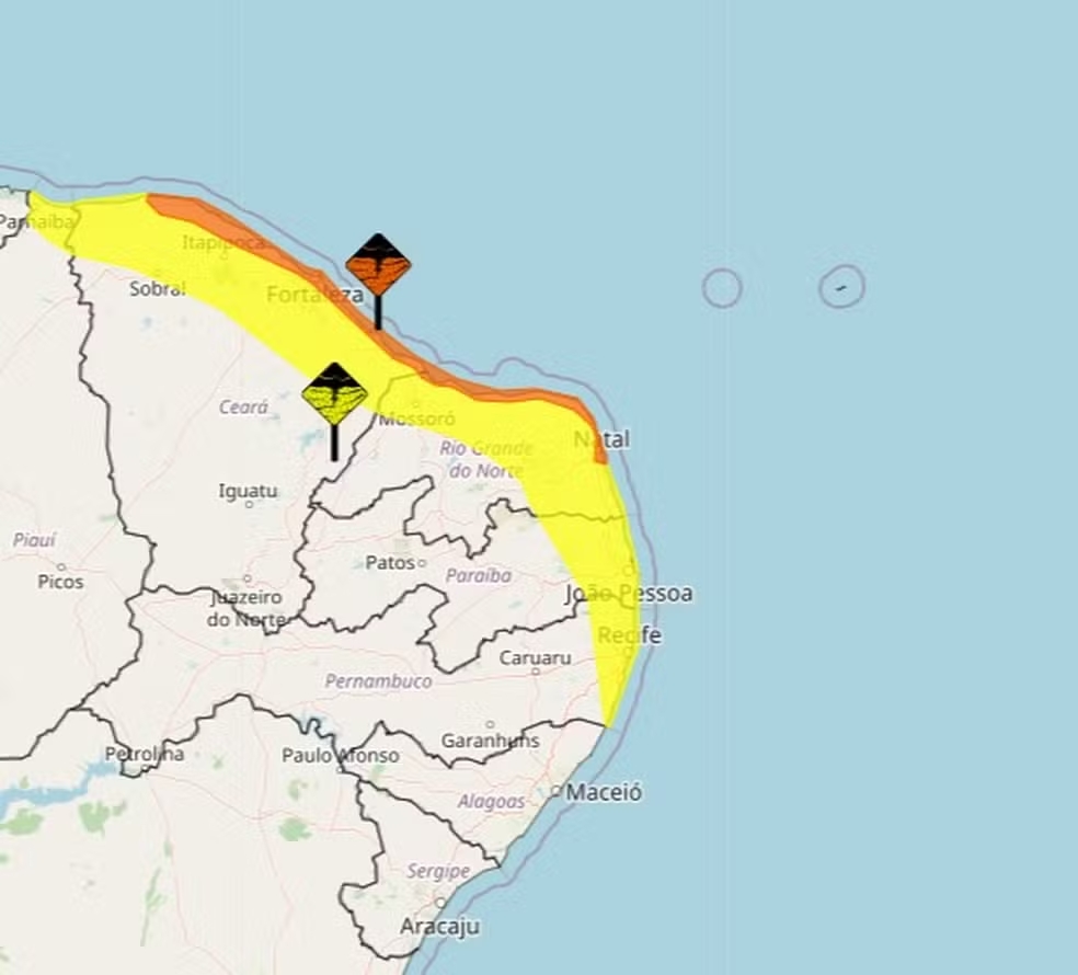 Um dos avisos, da cor laranja (perigo), prevê chuvas de até 100 milímetros por dia. A capital Natal está inclusa nesse alerta. O outro alerta é da cor amarela (perigo potencial).