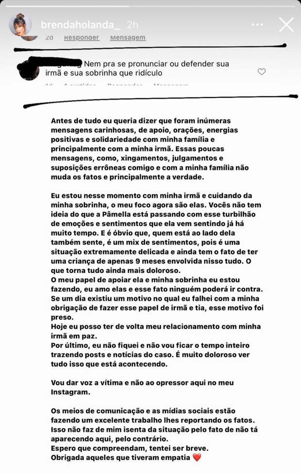 irmã da ex-mulher de DJ Ivis, Brenda Holanda, fez um desabafo em seu perfil no Instagram falando sobre os comentários de ódio que tem recebido. Na publicação, Brenda disse também que está ajudando Pamella Holanda com os cuidados da sobrinha e comemorou a prisão do músico.