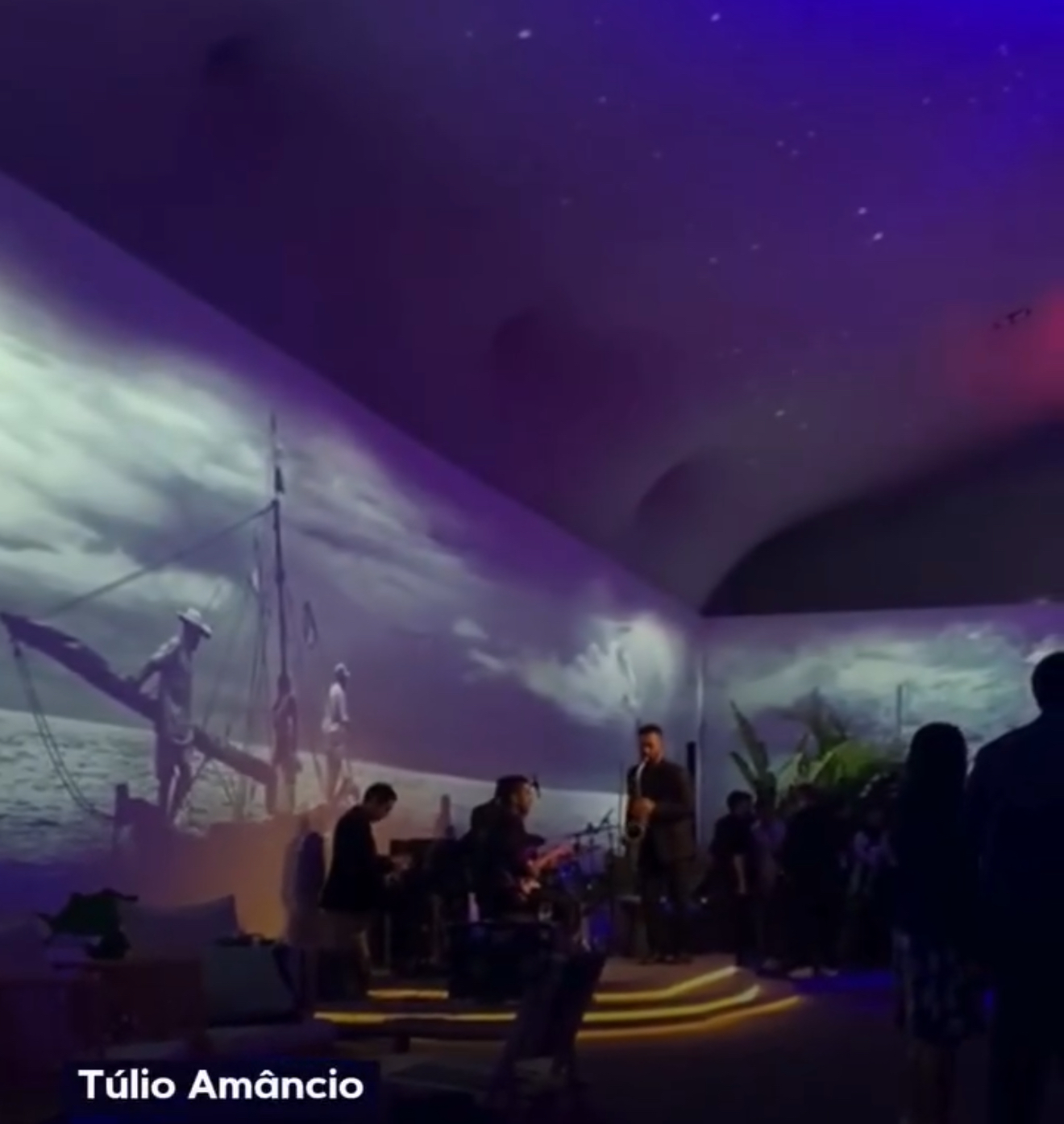 Uma atmosfera elegante e teatral marcou a noite. Luzes azuis e violetas, posicionadas estrategicamente, criavam um clima cênico e sofisticado – típico de uma recepção formal, porém intimista. Nos telões instalados nos quatro cantos do salão, imagens de ribeirinhos, da Amazônia e da cultura paraense se alternavam ao som da inconfundível lambada paraense.