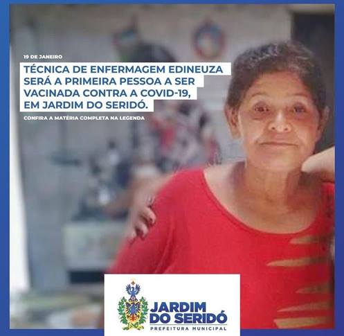 “E é com toda satisfação, que iremos dar esse ponta a pé inicial vacinando a Técnica em Enfermagem, Edineuza, que desempenha seu papel de Profissional de Saúde, há mais de 40 (quarenta) anos , neste município, levando conforto aos doentes em suas casas e mesmo possuindo comorbidades (diabetes) não deixou de realizar seus atendimentos e assistência aos doentes de nossa cidade durante a Pandemia”.
