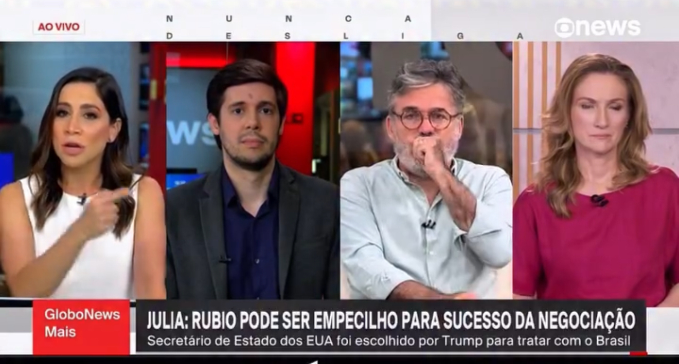 “Curioso, o Lins falava do posicionamento do líder do PL na Câmara, meio que torcendo para não dar certo a negociação de tarifa. É isso, Lins?”, questionou um dos jornalistas, ao que outro completou: “Eles diziam que eram contra as tarifas porque são contra o Brasil, mas agora comemoram que o Rubio vai dificultar as conversas?”.