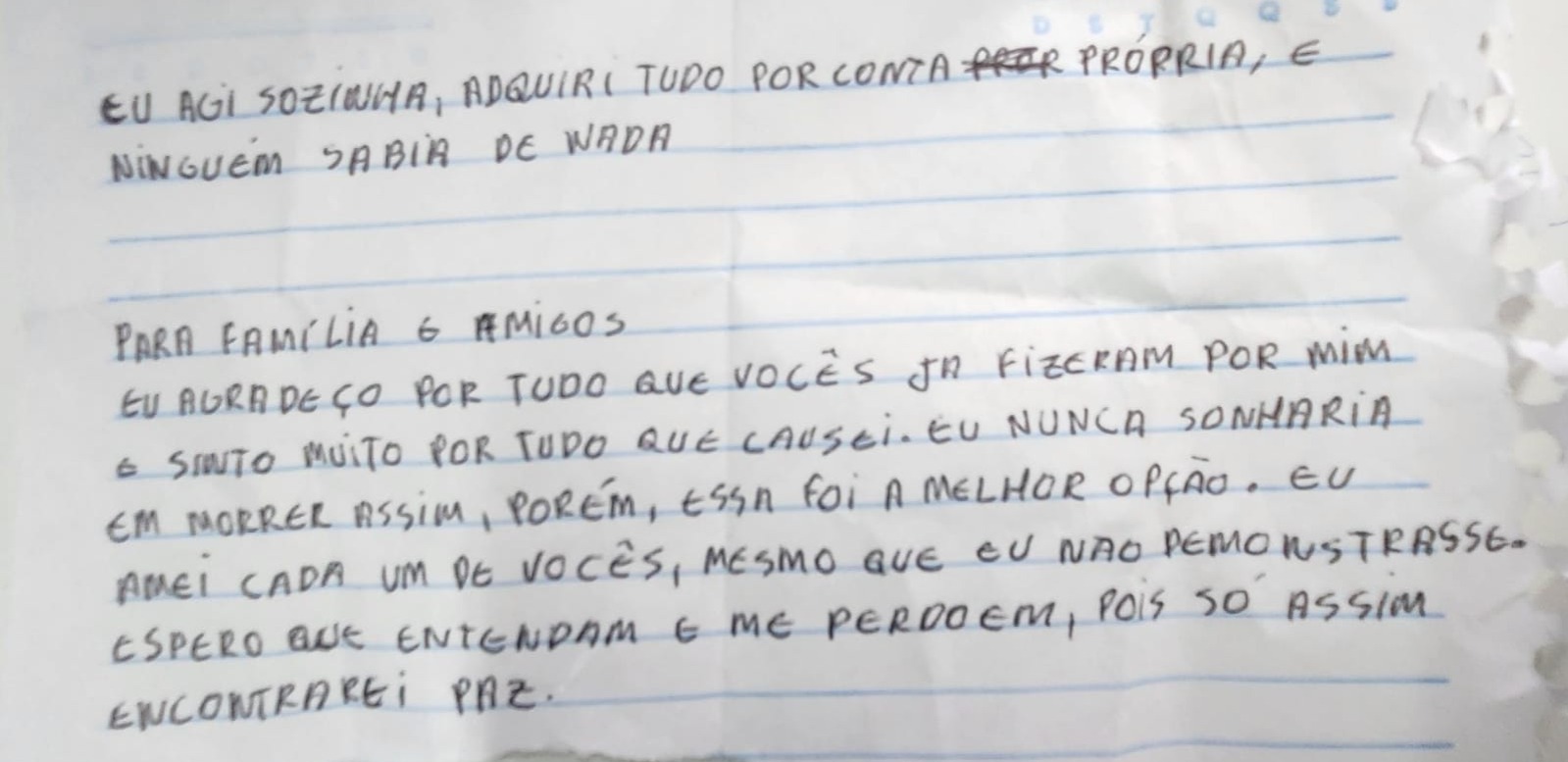 “Para família e amigos: eu agradeço por tudo que vocês já fizeram por mim e sinto muito por tudo que causei. Eu nunca sonharia em morrer assim, porém, essa foi a melhor opção. Eu amei cada um de vocês, mesmo que eu não demonstrasse. Espero que entendam e me perdoem, pois só assim encontrarei paz”.