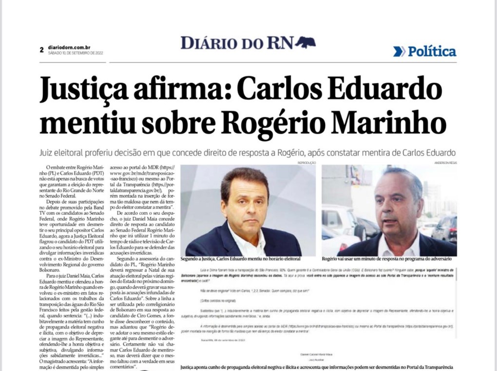Para o juiz Daniel Maia, Carlos Eduardo mentiu e ofendeu a honra de Rogério Marinho quando envolveu o ex-ministro em fatos relacionados com os trabalhos da transposição das águas do Rio São Francisco feitos pela gestão federal, quando sentencia “(…) indubitavelmente a matéria tem cunho de propaganda eleitoral negativa e ilícita com objetivo de depreciar a imagem do Representante, ofendendo-lhe a honra objetiva e subjetiva, divulgando informações sabiamente inverídicas…”.