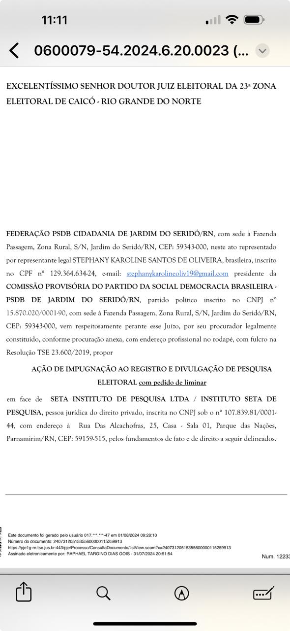 Um pesquisa eleitoral realizada pelo instituto SETA, e prevista para ser divulgada no dia de hoje, teve um pedido de impugnação indeferido pela justiça eleitoral.