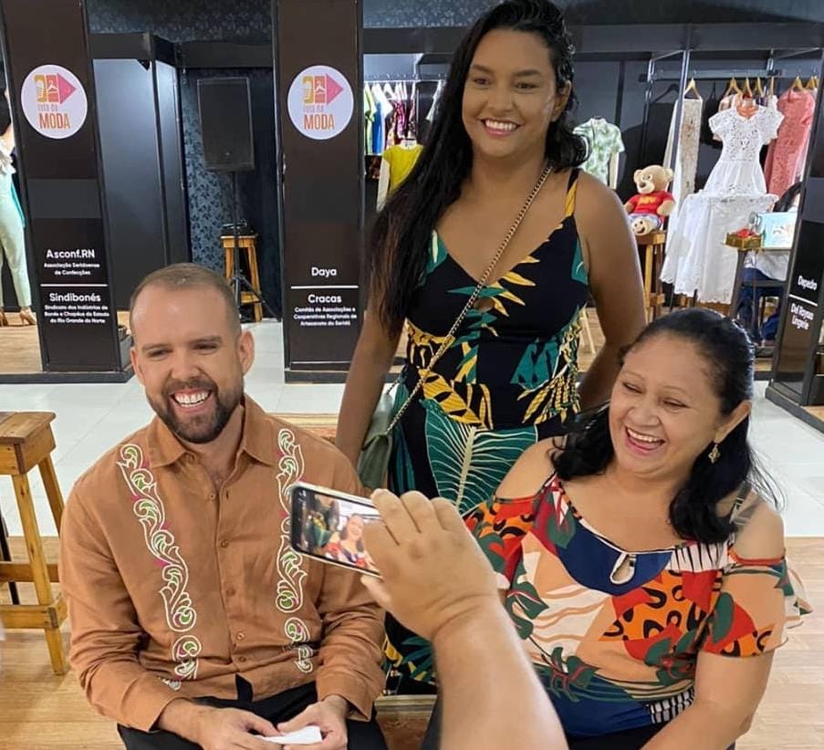 Marcus ladeado das artesãs Iully Alexia e Anair Costa