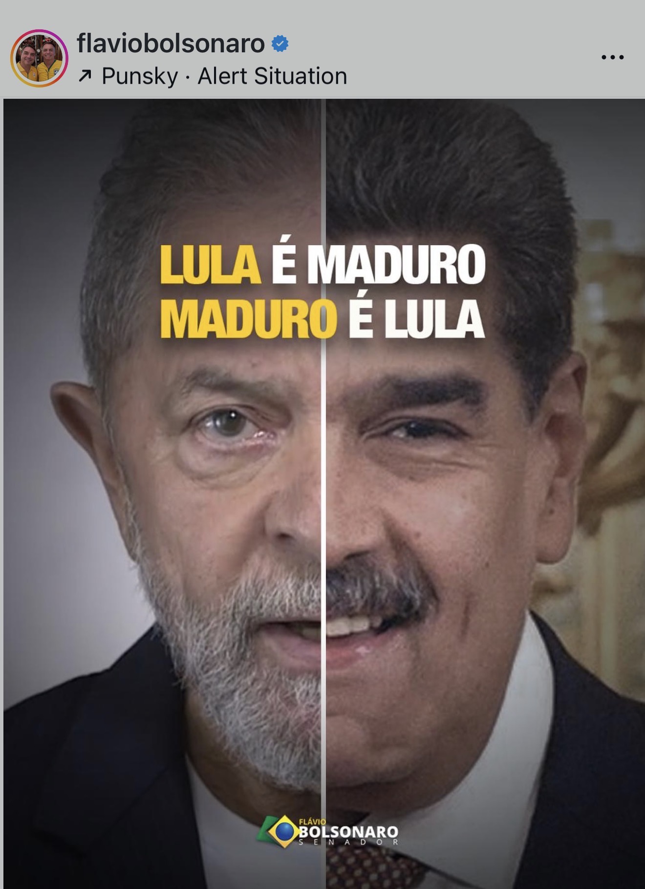 “Lula será delatado. É o fim do Foro de São Paulo: tráfico internacional de drogas e armas, lavagem de dinheiro, suporte a terroristas e ditaduras, eleições fraudadas…”, disse Flávio no dia em que Maduro foi capturado por militares americanos.