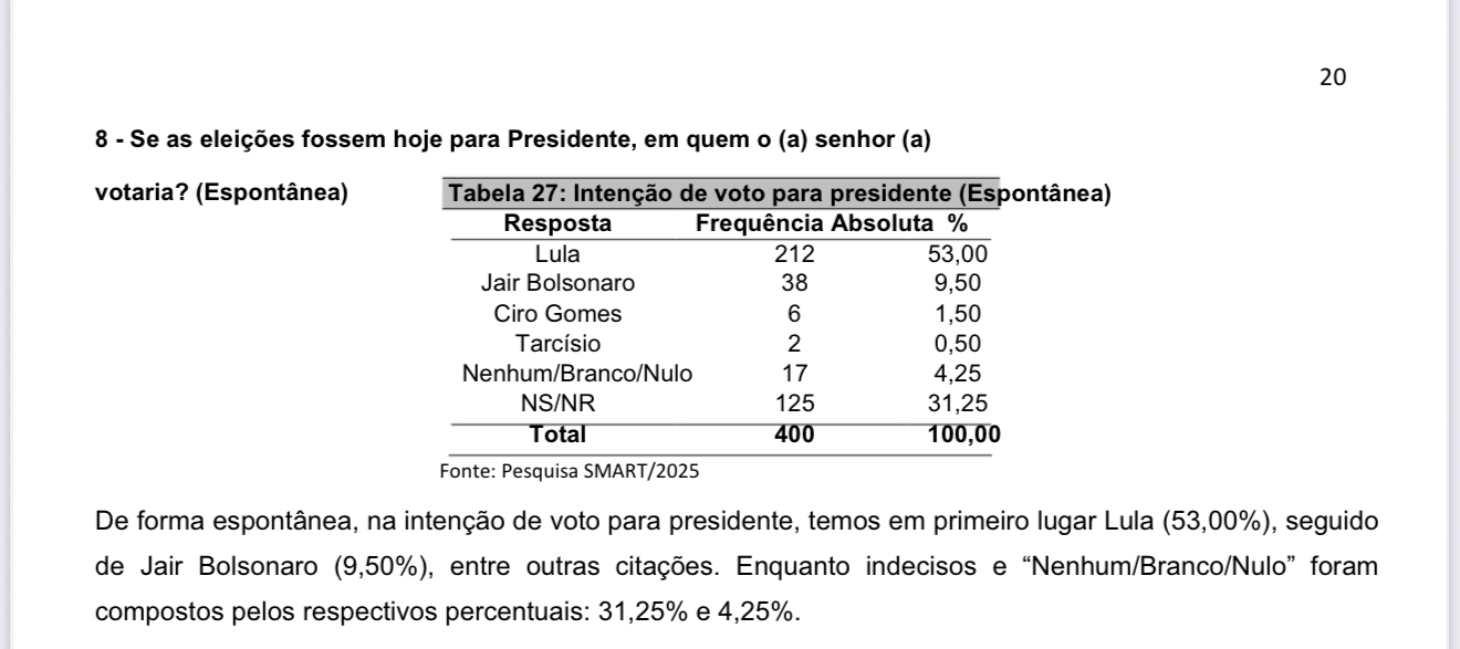 De acordo com os números, Lula aparece com 53,00% das intenções de voto, seguido pelo ex-presidente Jair Bolsonaro (PL), que registra 9,50%. Em seguida, aparecem Ciro Gomes (PSDB) com 1,50%, e o governador de São Paulo, Tarcísio de Freitas (Republicanos), com 0,50%. Já 4,25% dos entrevistados afirmaram que votariam em nenhum, branco ou nulo, enquanto 31,25% disseram não saber ou não responderam.