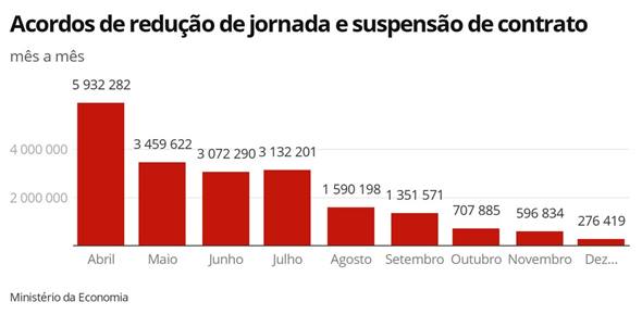 O número de acordos celebrados entre empresas e empregados com carteira assinada foi de 20.119.302 até dezembro. Esse número reflete os acordos iniciais e as prorrogações dos mesmos e, por isso, supera o número de trabalhadores afetados.
