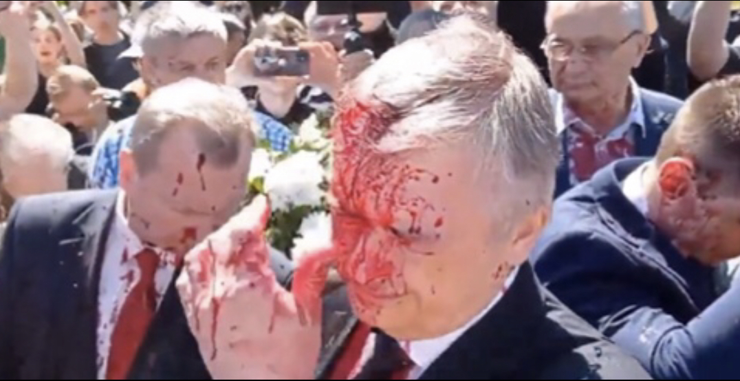 Manifestantes jogam tinta vermelha em embaixador russo na Polônia; assista