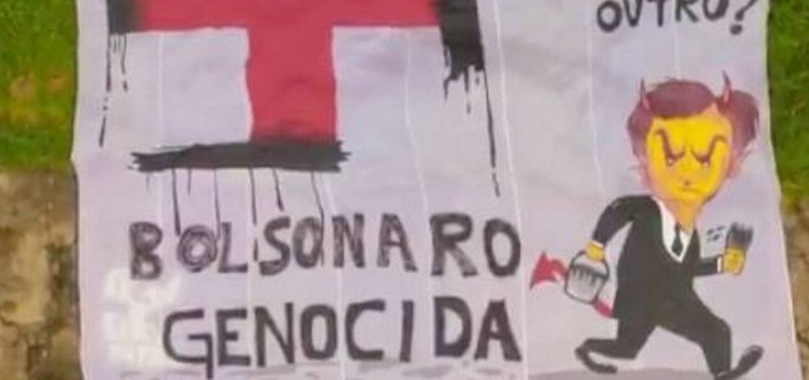 A faixa chamava o presidente de “genocida” e o associava a uma suástica, símbolo do regime nazista de Adolf Hitler na Alemanha, que foi responsável por uma política de extermínio de 6 milhões de judeus, segundo cálculos de historiadores.