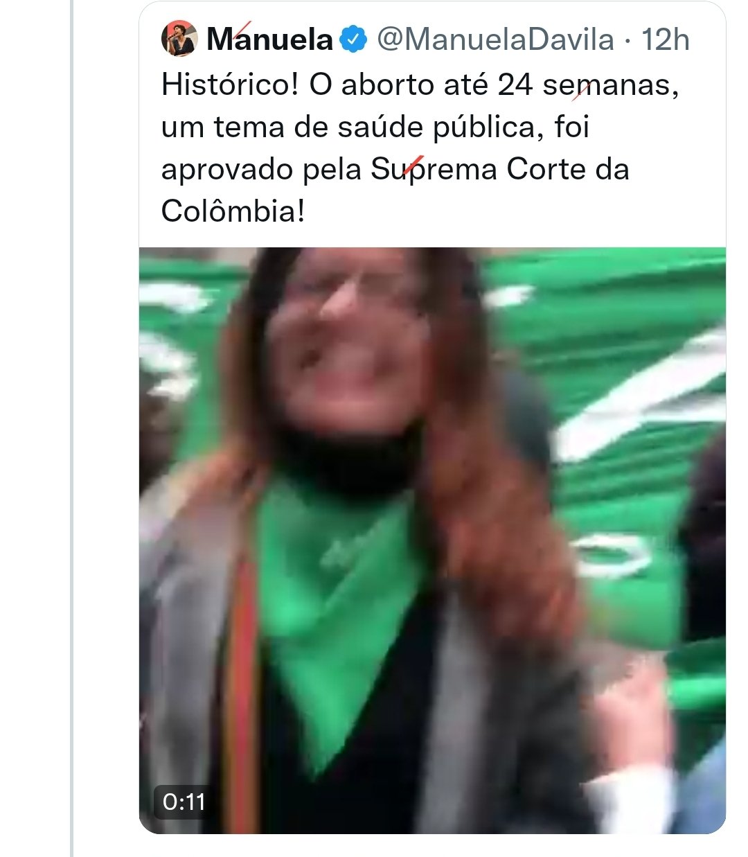 “Histórico! O aborto até 24 semanas, um tema de saúde pública, foi aprovado pela Suprema Corte da Colômbia”, escreveu Manuela D’Ávila em no Twitter nesta segunda-feira (21). Em seguida, a ex-deputada apagou a publicação.