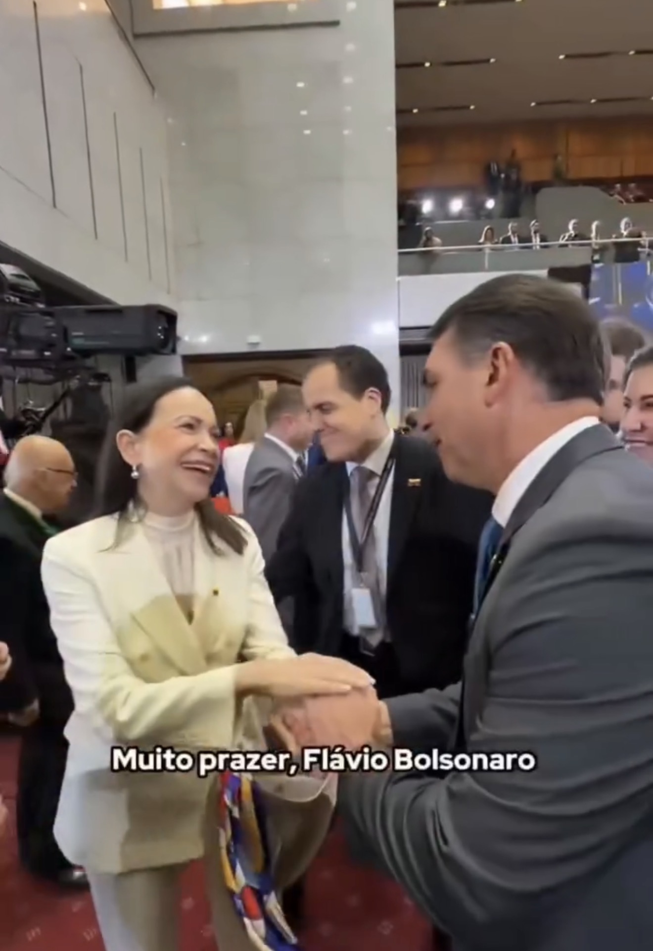 Durante o encontro, Flávio Bolsonaro demonstrou admiração pela líder venezuelana: