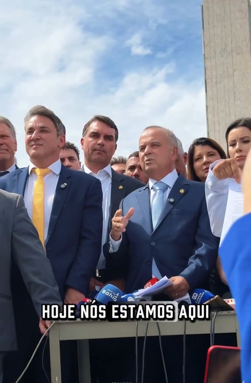 Além de Marinho, o senador Flávio Bolsonaro (PL), filho 01 de Bolsonaro, também participou da entrevista coletiva com os colegas de oposição, no gramado em frente ao Congresso. Ele apresentou a proposta do que chamou de “pacote da paz”, que engloba a “anistia ampla geral e irrestrita”, o impeachment do ministro Alexandre de Moraes e a PEC do fim do Foro Privilegiado.