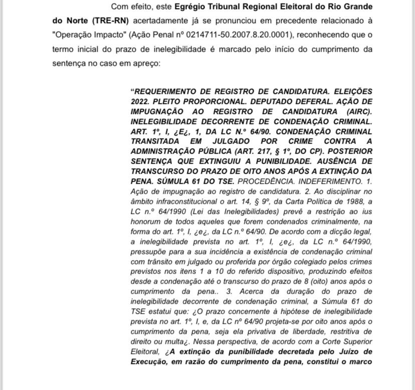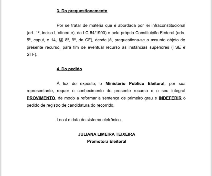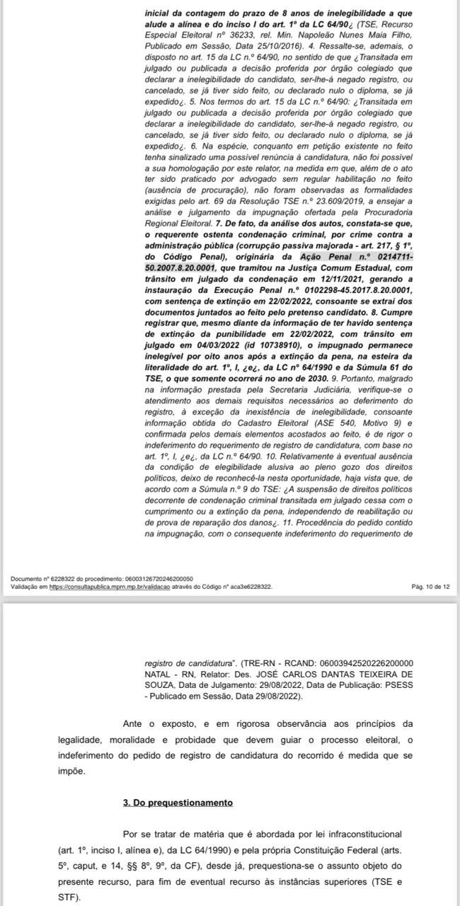 Na manifestação do Ministério Público Eleitoral, ela assevera que o apresentador cometeu crime de Corrupção Passiva, previsto no Art 317 do código Penal, tendo o apresentador condenado às penas 03 anos, 08 meses e muitas, inclusive as penas foram cumpridas em agosto de 2021, estando remanescente sua Inegibilidade pelo período de 08 anos, que no entender do ministério Público, o apresentador se encontra inelegível até agosto de 2029.