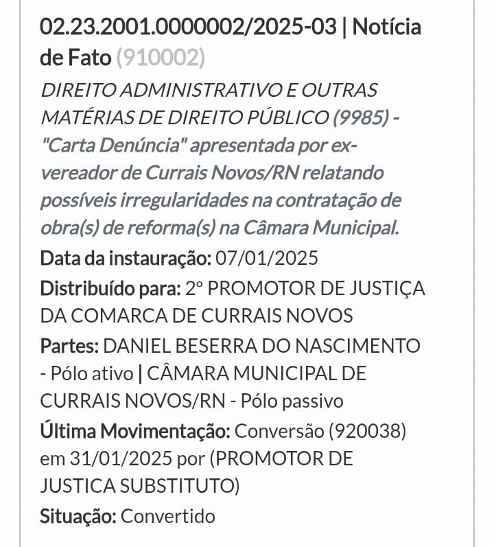As denúncias estão sendo apuradas pelo Ministério Público após o ex-vereador Daniel Bezerra ter levado a público e apresentado como notícia de fato à 2° Promotoria de Justiça. Diante disso, foram abertos processos administrativos que irão acompanhar aquela Instituição Legislativa.