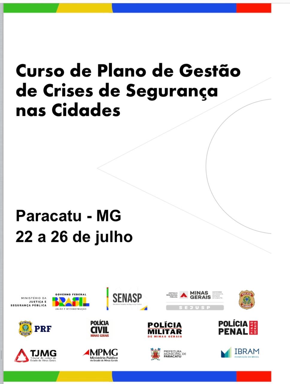 Tiros de festim, veículos queimados, entre outros elementos. Toda essa combinação será utilizada para simular um ataque de quadrilha durante o Curso de Plano de Gestão de Crises de Segurança nas Cidades, promovido pelo Ministério da Justiça e Segurança Pública (MJSP), por meio da Secretaria Nacional de Segurança Pública (Senasp), e o Instituto Brasileiro de Mineração (Ibram). A capacitação será realizada em Paracatu, na região Noroeste de Minas Gerais, de 22 a 26 de julho (segunda a sexta-feira).