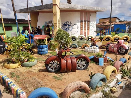 Moradores do bairro Nossa Senhora da Apresentação, na Zona Norte de Natal, transformaram um terreno de um posto policial desativado, que estava abandonado, em um espaço de lazer para a comunidade. Todos os equipamentos construídos no espaço foram feitos com uso de material reutilizado, principalmente pneus e garrafas pet.