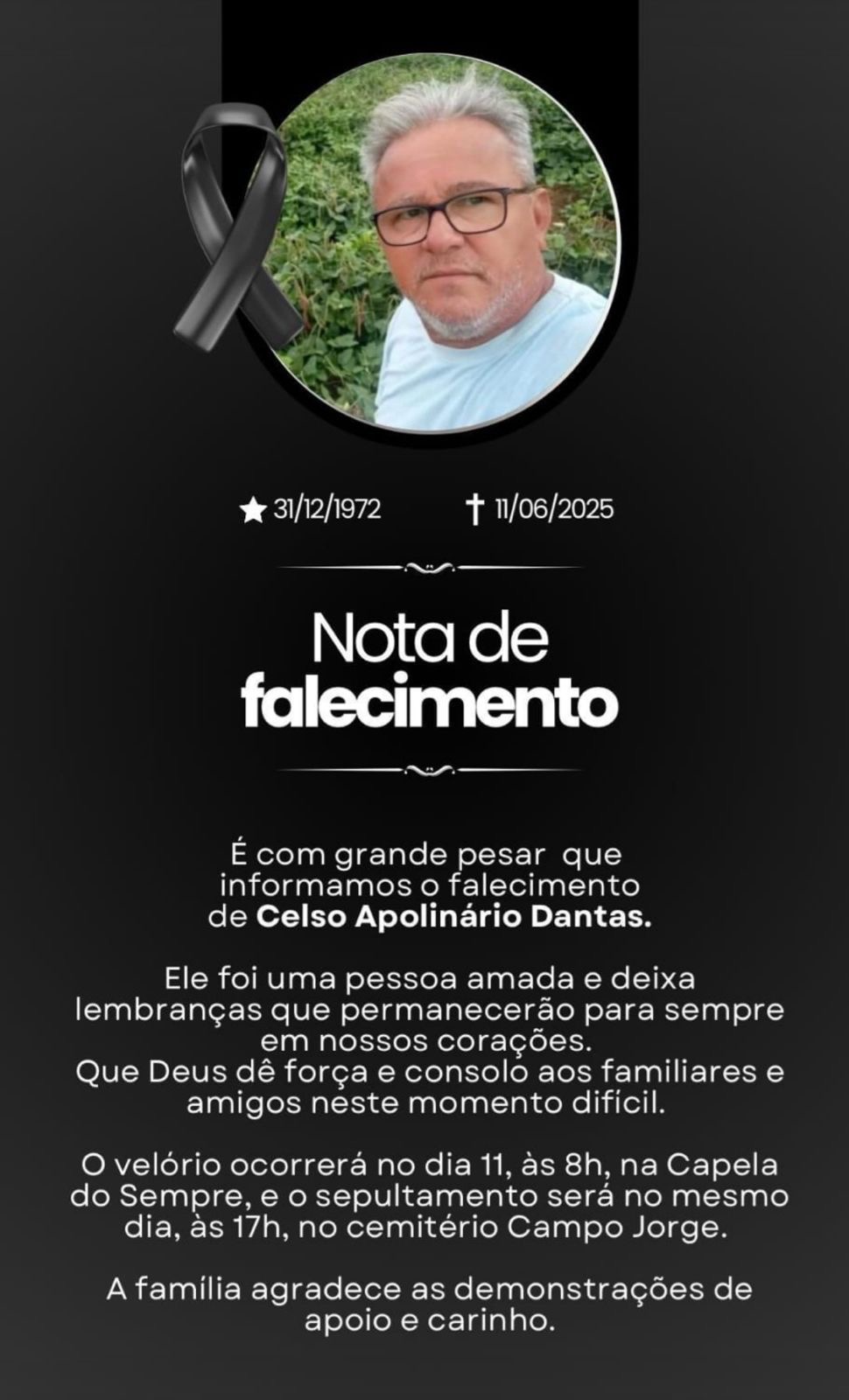 De acordo com a nota da família, Celso Dantas nasceu no ano de 1972. O velório acontece nesta quarta-feira (11), na capela do SEMPRE, no centro da cidade de Caicó, desde às 8h do dia de hoje. Celso lutava contra um câncer ósseo, mas acabou perdendo a luta árdua para um inimigo invisível, mas avassalador.