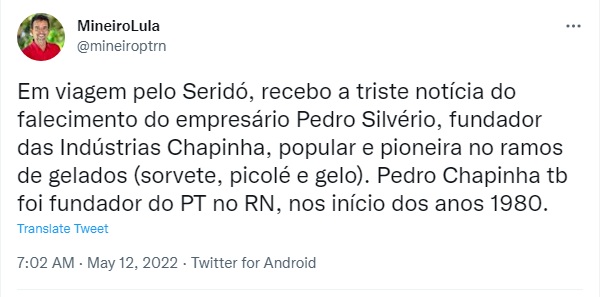 O Ex-secretário de Projetos e Metas e de Relações Institucionais do RN e atual pré-candidato a deputado federal pelo PT/RN, Fernando Mineiro, informou na manhã desta quinta-feira (12) pelo Twitter que recebeu a notícia do falecimento do empresário Pedro Silvério, fundador das Indústrias Chapinha, popular e pioneira no ramos de gelados (sorvete, picolé e gelo).