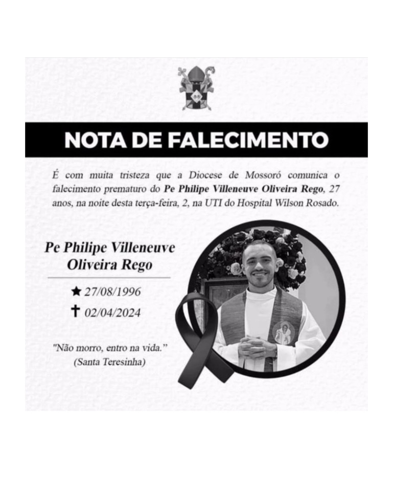 A Diocese de Mossoró comunica, com profunda tristeza, o falecimento prematuro do Padre Philipe Villeneuve, aos 27 anos, ocorrido na noite desta terça-feira, na UTI do hospital Wilson Rosado, em Mossoró-RN.