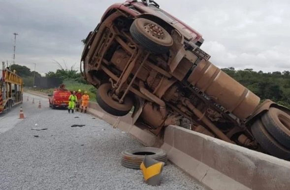 Um caminhão que carregava britas capotou e acabou ficando pendurado em uma mureta da BR-381, em Contagem, região metropolitana de Belo Horizonte, nesta segunda-feira (4). O acidente ocorreu na altura do quilômetro 482, no sentido São Paulo. O condutor foi ejetado para fora do veículo.