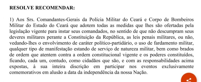 “Tendo em vista a diversidade de interpretações concernentes a minha última recomendação expedida, datada de 25 de Agosto de 2021, tratando sobre providencias que devem ser adotadas pelos Comandantes Militares no que versa â conduta militar a ser executada quando do festejo nacional na data da independência do Brasil, este Promotor de Justiça Militar resolve republicar a recomendação outrora emanada por este gabinete, ratificando a ideia, porém de forma mais clara, para que se afastem interpretações diversas” assinou o Promotor de Justiça Militar Sebastião Brasilino de Freitas Filho.