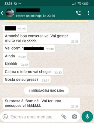 O homem, que está foragido, teria enviado uma mensagem para a vítima minutos antes do crime, em que pergunta “gosta de surpresa?” (Veja print da mensagem abaixo). A Polícia Militar foi acionada por volta das 23h40 para atender a ocorrência. E ao chegar ao local, os policiais encontraram a vítima já sem vida. Thalia será enterrada na tarde desta sexta-feira (25) em Jaraguá do Sul. Ela deixa dois filhos de 3 e 6 anos.