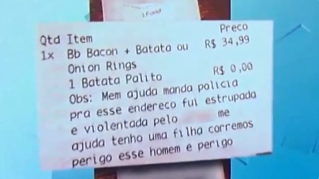 “Me ajuda, manda a polícia para esse endereço. Fui estuprada e violentada”, diz trecho de mensagem deixada na descrição do pedido. A mensagem foi lida pela atendente da lanchonete, que ligou para a Polícia Militar. O caso ocorreu na segunda-feira (8).