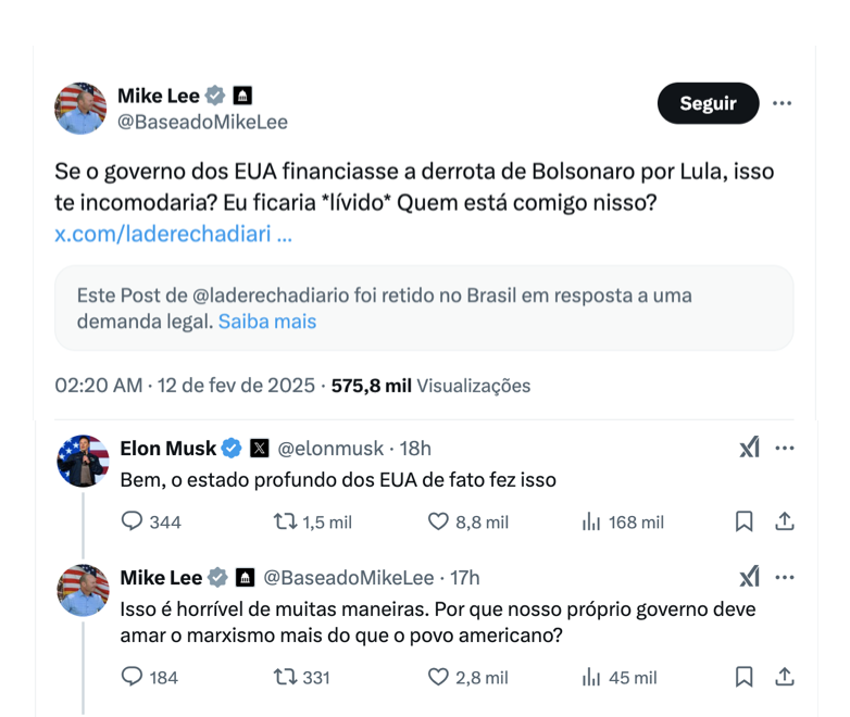 O chefe do Doge (Departamento de Eficiência Governamental) Elon Musk disse nesta 4ª feira (12.fev.2025) que o “deep state” do governo dos Estados Unidos financiou a vitória do presidente Luiz Inácio Lula da Silva (PT) contra o ex-presidente Jair Bolsonaro (PL) em 2022.