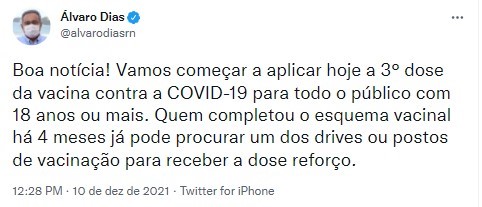 O prefeito de Natal, Álvaro Dias, anunciou na tarde desta sexta-feira (10) que vai liberar a aplicação da terceira dose da vacina a todo mundo que se vacinou há mais de 4 meses em Natal e que tem mais de 18 anos.