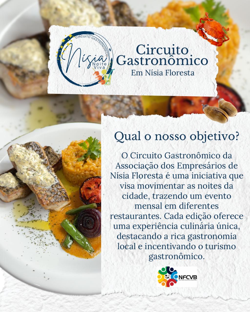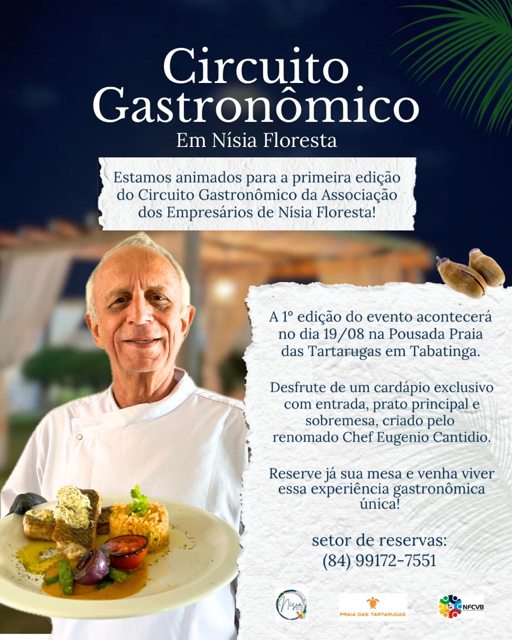 Para celebrar essa tradição gastronômica, o Nísia Floresta Convention & Visitors Bureau lança, a partir do dia 19 de agosto, o Circuito Gastronômico de Nísia Floresta, que promete ser um evento imperdível para os amantes da boa mesa. O circuito terá início na Pousada Praia das Tartarugas, pertencente ao Complexo Camurutaba e localizada em Barra de Tabatinga, onde será oferecido um menu completo com entrada, prato principal e sobremesa ao valor de R$ 135. O Cardápio na Pousada Praia das Tartarugas será do chef Eugênio Cantídio.