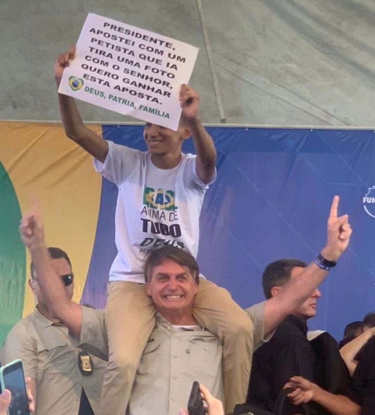 O cartaz dizia: “Presidente, apostei com um petista que ia tirar uma foto com o senhor. Quero ganhar esta aposta. Deus, Pátria, Família”.