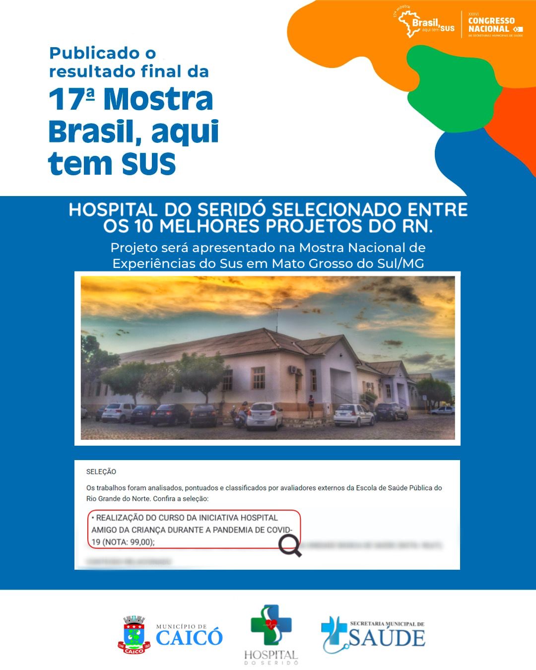 O Conselho de Secretarias Municipais de Saúde do Rio Grande do Norte (Cosems-RN) divulgou, nesta sexta-feira (20), a relação das 10 experiências potiguares exitosas selecionadas para a 17ª Mostra “Brasil, aqui tem SUS”..A cidade de Caicó foi selecionada com a experiência da ‘Realização do Curso da Iniciativa Hospital Amigo da Criança Durante a Pandemia de Covid-19’ com nota 99,00. O trabalho foi escrito pela equipe do Banco de Leite e direção do Hospital do Seridó..O prefeito de Caicó, Dr. Tadeu, que é médico, falou sobre a classificação: “é o reconhecimento de um trabalho que, na prática, já deu resultado e beneficiou a população. O SUS funciona e Caicó sabe disso. Parabenizo Evaneide Nóbrega, nossa secretária de saúde, Gedson Santos, diretor do Hospital do Seridó, dedicados ao que fazem, e toda equipe do Banco de Leite. Como prefeito, eu não poderia estar mais satisfeito em ver o Hospital do Seridó se tornar essa referência”, afirmou.A secretária de saúde, Evaneide Nóbrega, afirmou: “para nós é motivo de muita alegria e gratidão a Deus, pois essa seleção representa o reconhecimento do trabalho que nós estamos desenvolvendo na gestão Dr Tadeu e Toinho. Gedson ama o que faz, se dedica com todo amor e carinho nas ações que envolvem a maternidade, a ele e toda equipe todos os aplausos. O Congresso Nacional de Secretarias Municipais de Saúde irá acontecer em Julho e o Brasil estará vendo o trabalho que nós estamos desenvolvendo em Caicó para fortalecer as ações da saúde da mulher e da criança em nosso município”..A Mostra acontecerá durante o XXXVI Congresso Conasems, que será realizado entre 12 a 15 de julho, em Campo Grande, Mato Grosso do Sul. E Caicó vai estar representado.
