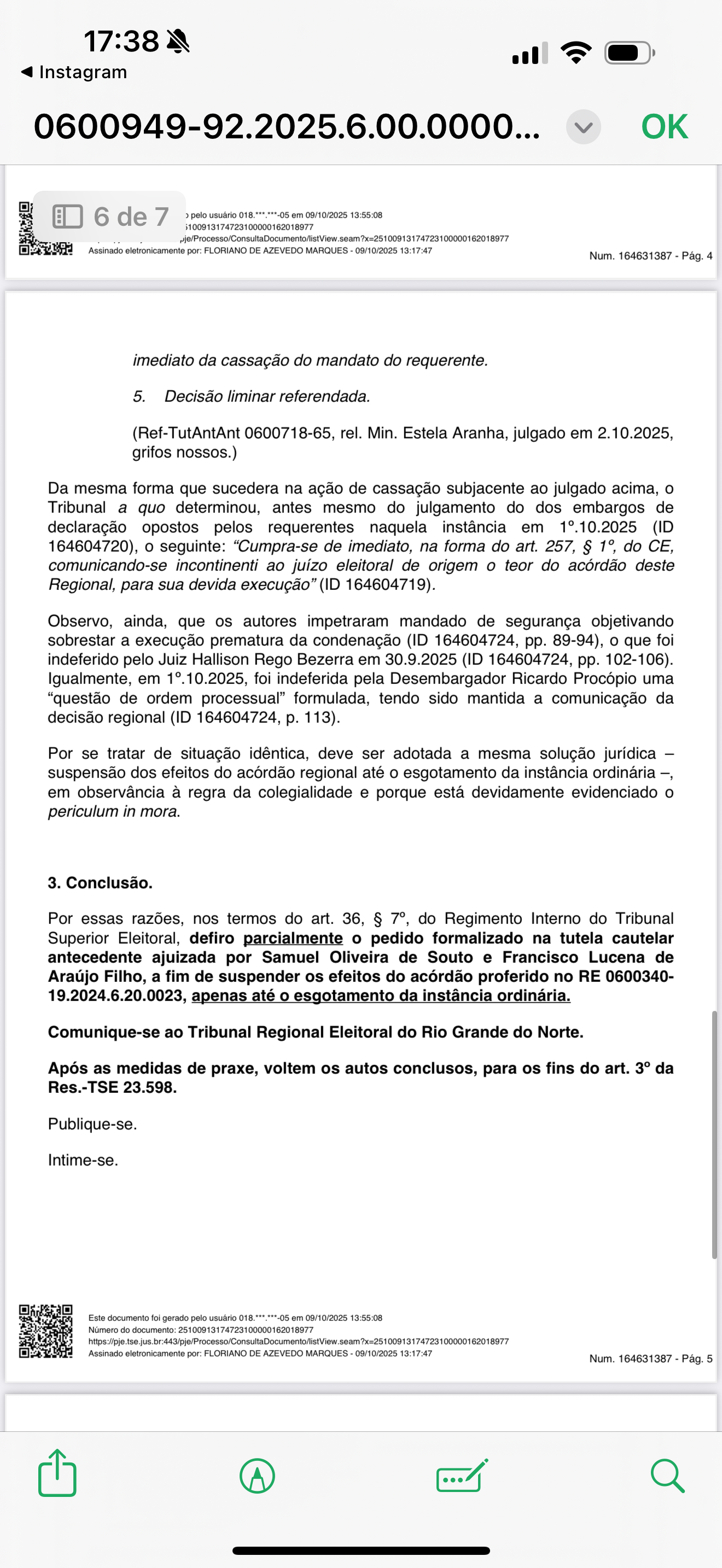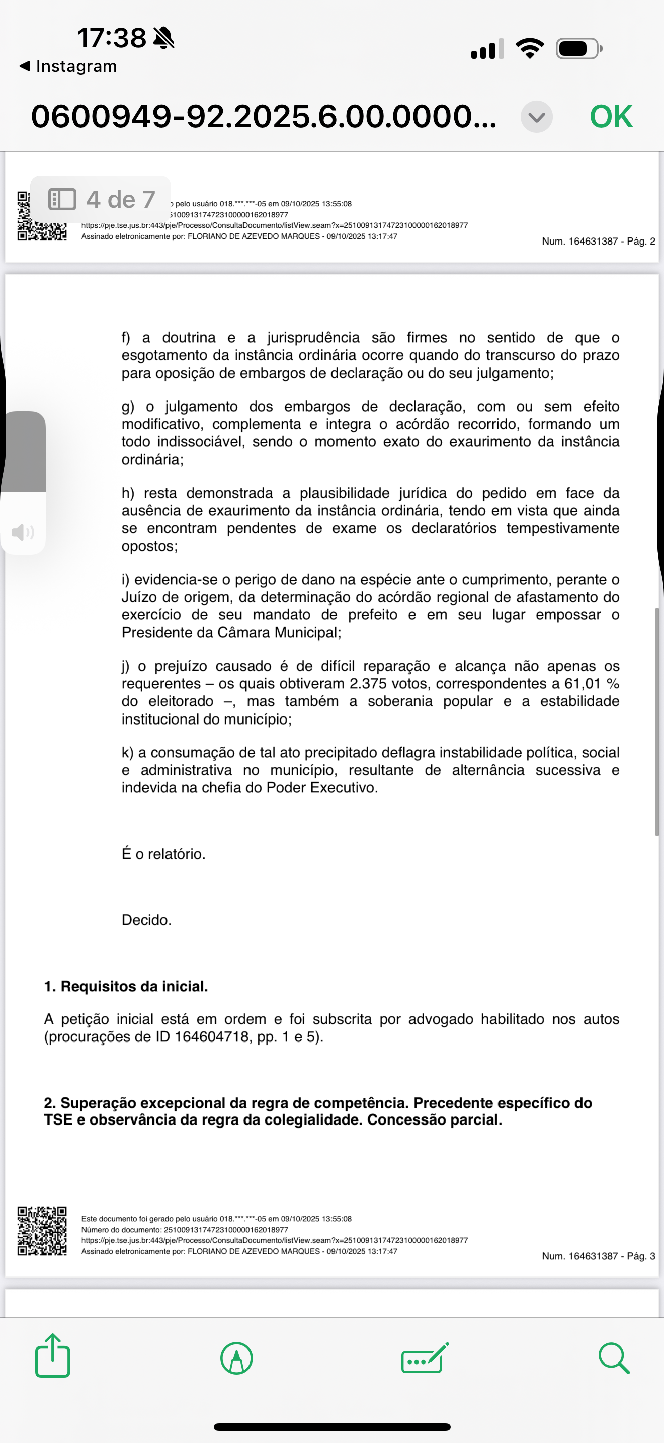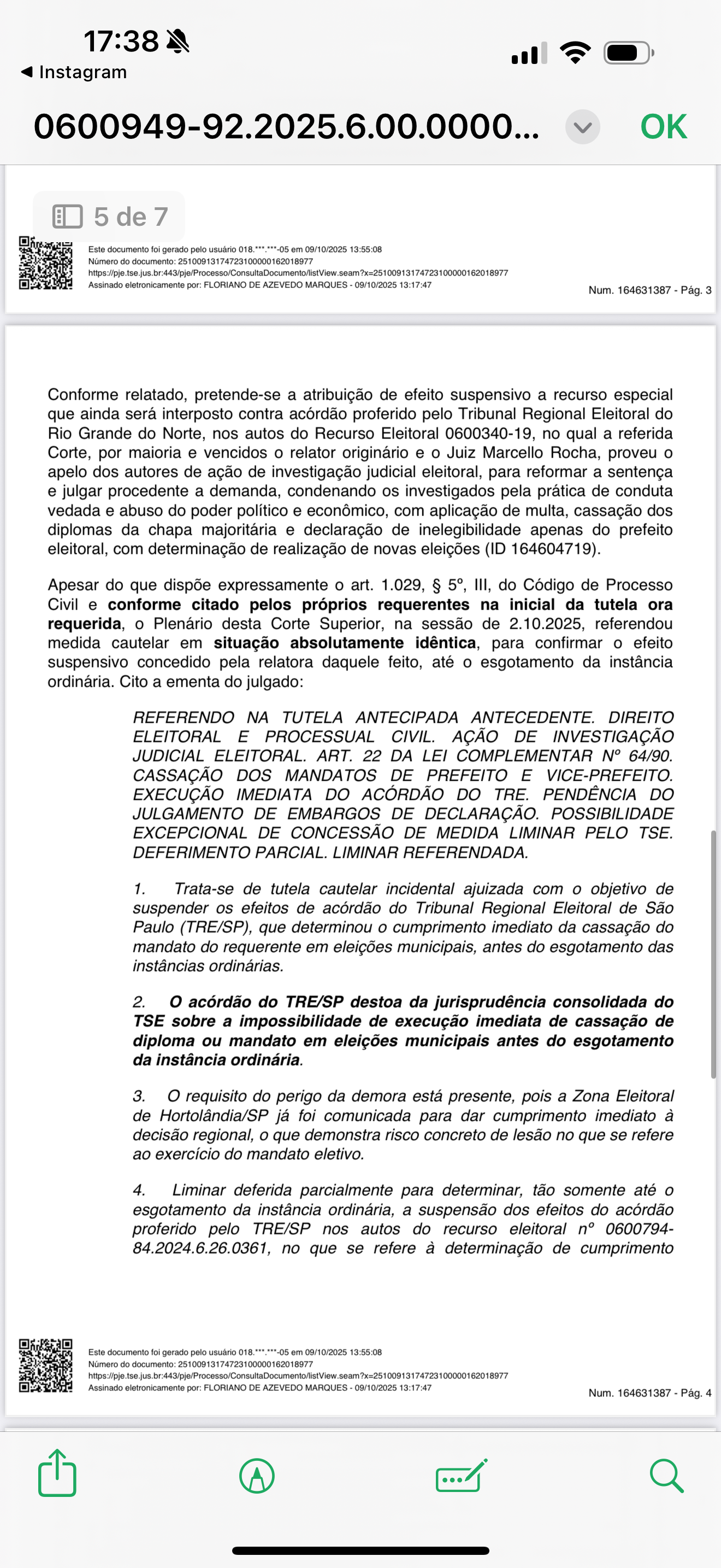 O ministro Floriano Marques ponderou que o TSE julgou situação idêntica, em Hortolândia/SP, já em 02/10/2025, que garantiu a manutenção dos cassados por alguns dias, até o esgotamento da instância do TRE local.