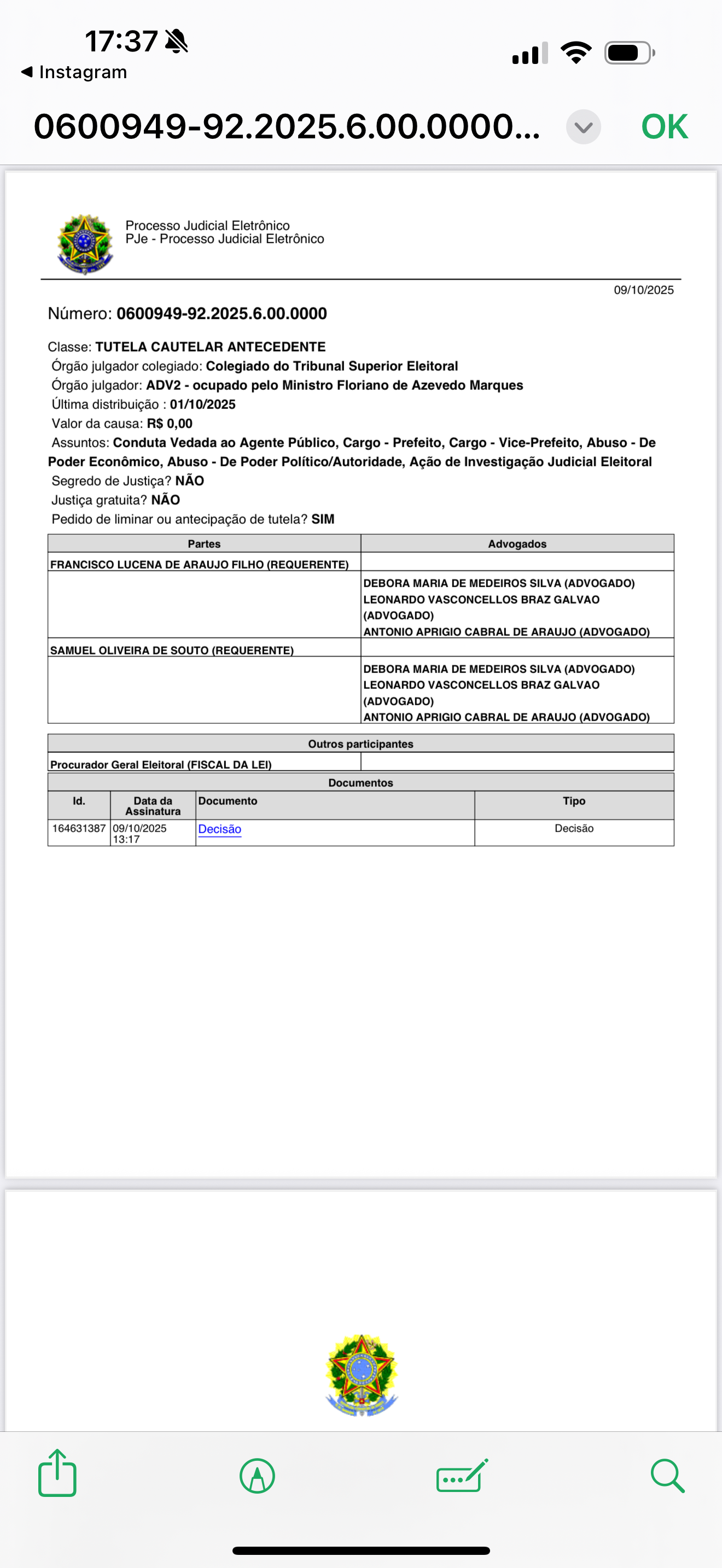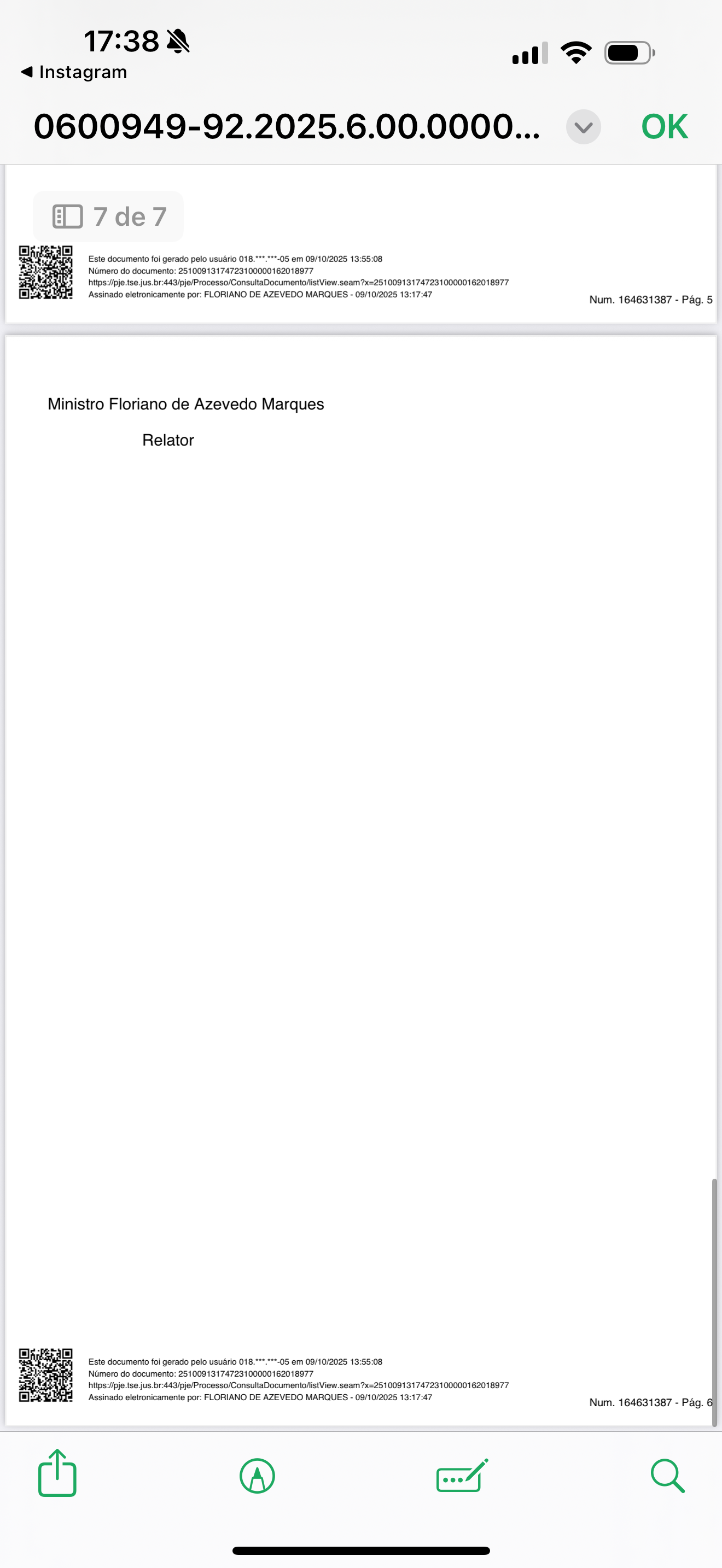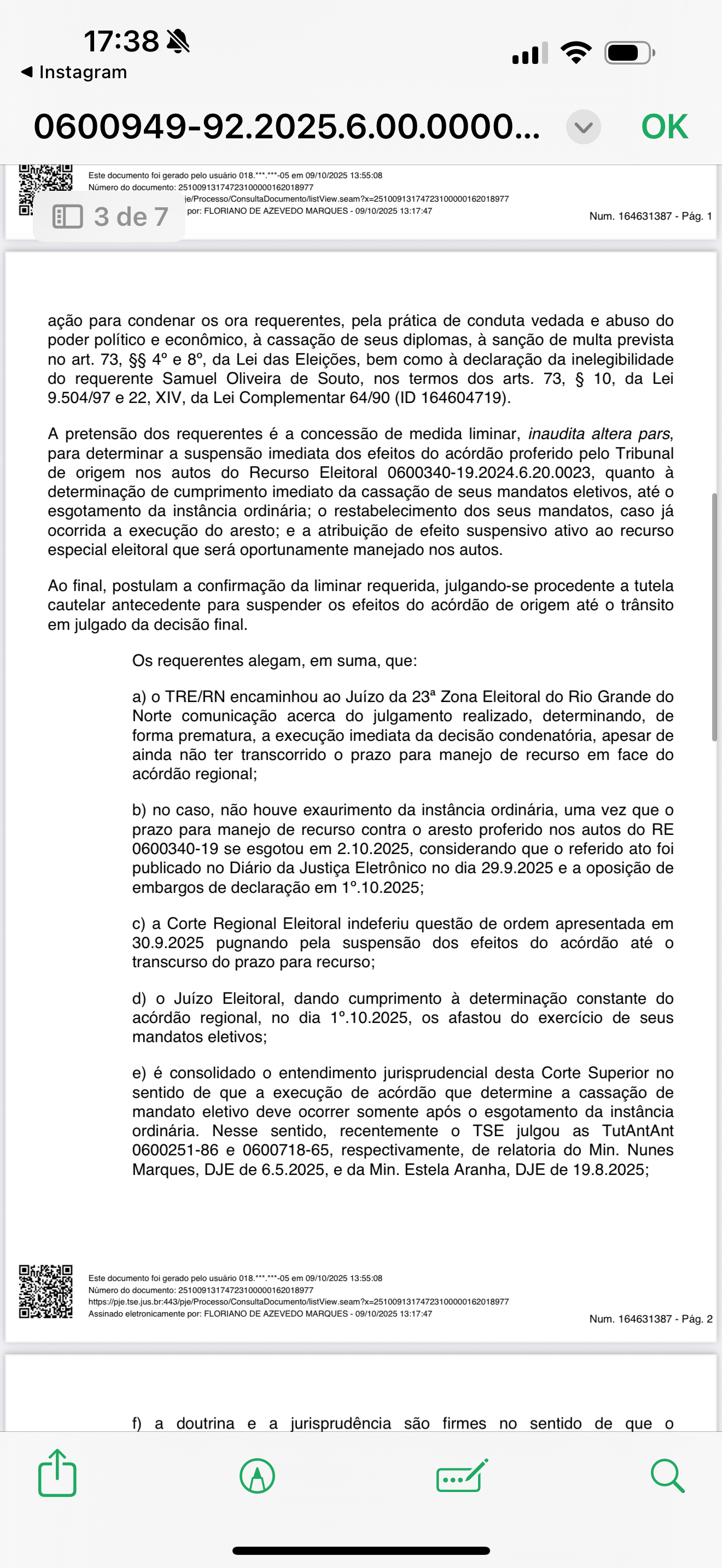 O ministro Floriano Marques ponderou que o TSE julgou situação idêntica, em Hortolândia/SP, já em 02/10/2025, que garantiu a manutenção dos cassados por alguns dias, até o esgotamento da instância do TRE local.