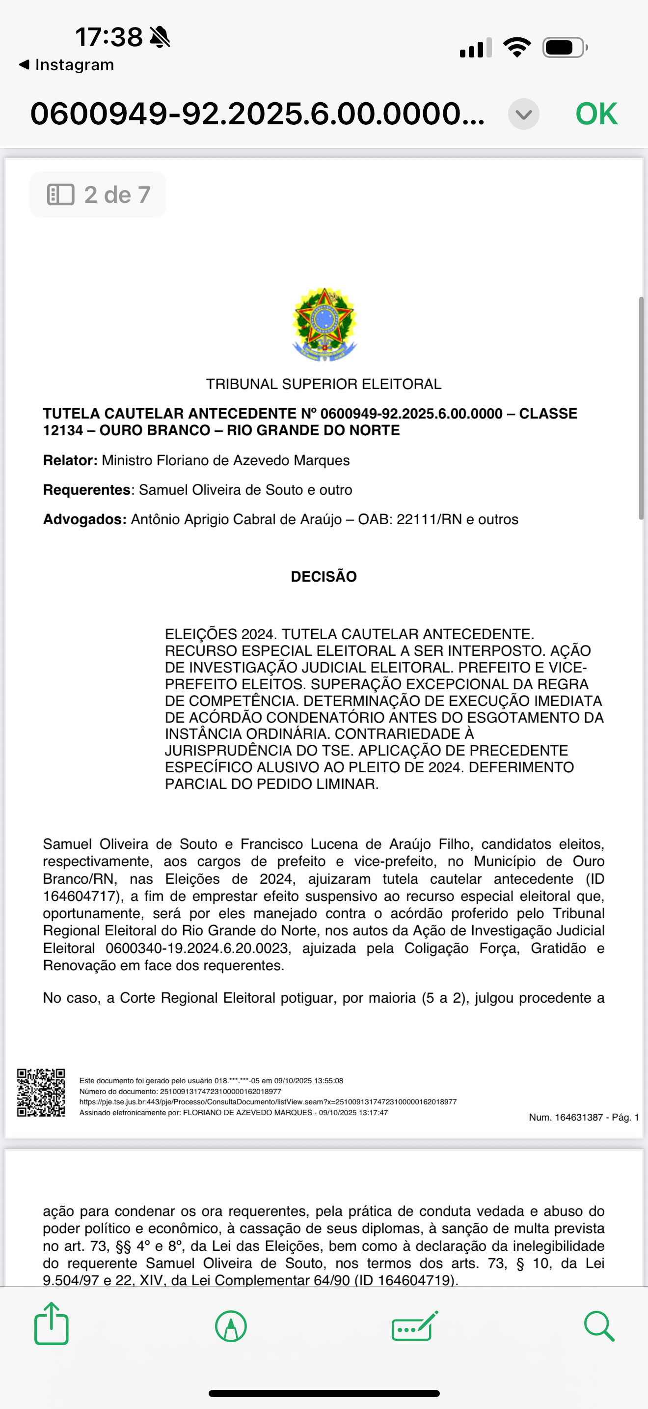 O Tribunal Superior Eleitoral suspendeu o afastamento do Prefeito de Ouro Branco, Samuel Souto, e seu vice prefeito Dr Araújo. A decisão é liminar e vale até o julgamento de recursos no TRE RN, em Natal.
