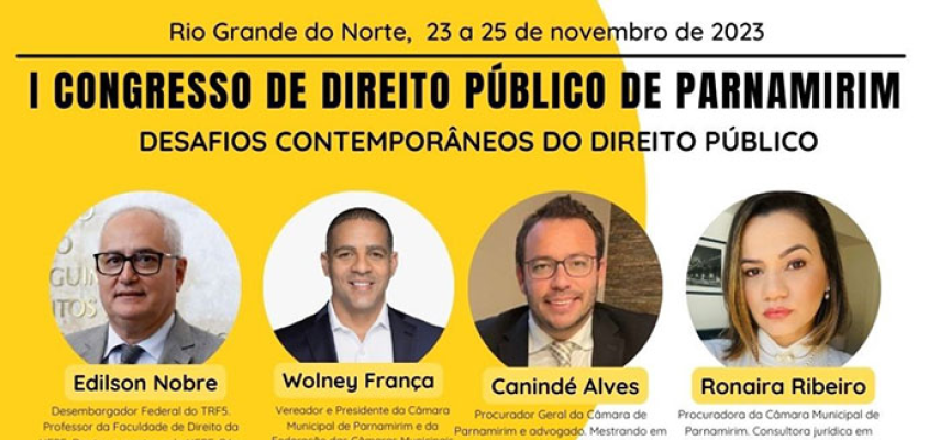 Com tema “Os Desafios Contemporâneos do Direito Público”, terá início, nesta quinta-feira (23), o I Congresso de Direito Público de Parnamirim, a partir das 18h, no Plenário Dr. Mário Medeiros, na Câmara Municipal. O evento está sendo promovido pela Casa Legislativa, em parceria com o Centro Universitário Natalense – UNICEUNA, e conta com o apoio da Editora Juriscoffee.