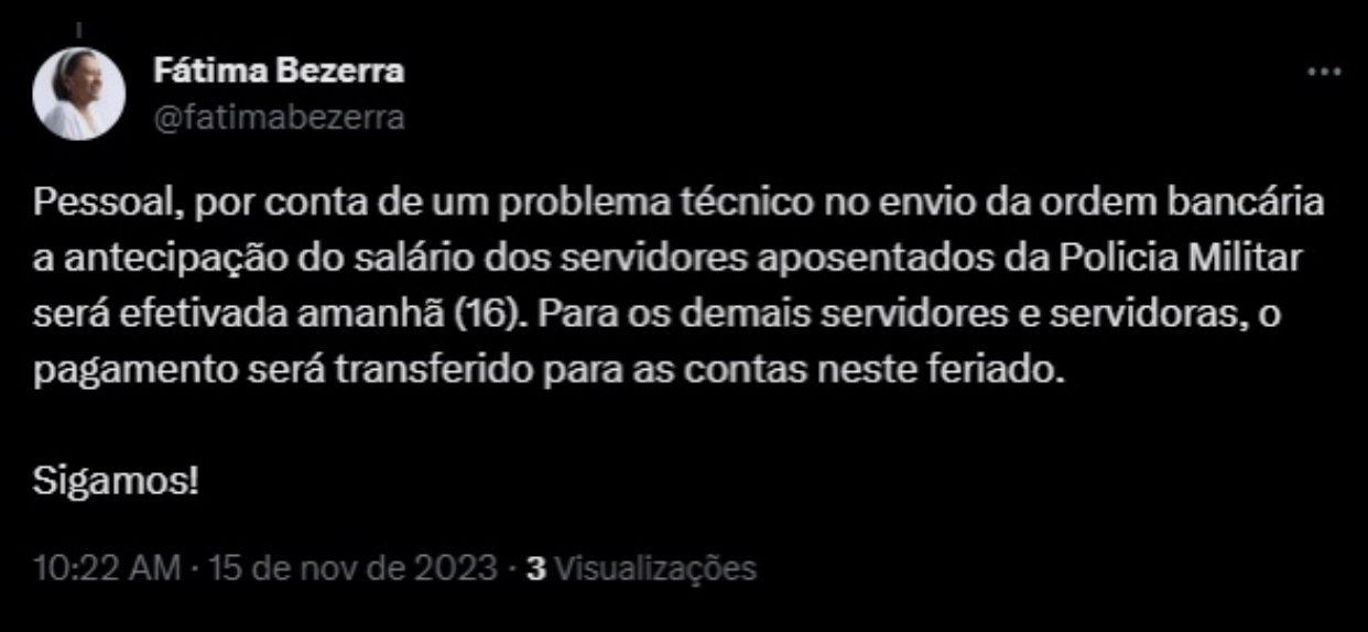 Segundo a governadora Fátima Bezerra, ocorreu um ‘problema técnico no envio da ordem bancária’.