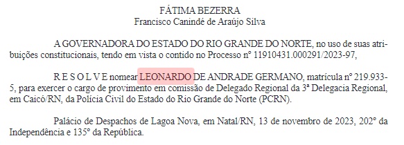 A nomeação do Dr. Leonardo foi publicada nesta quarta feira pela Governadora Fátima Bezerra e impressa no Diário Oficial do Rio Grande do Norte, Nº 15.546.