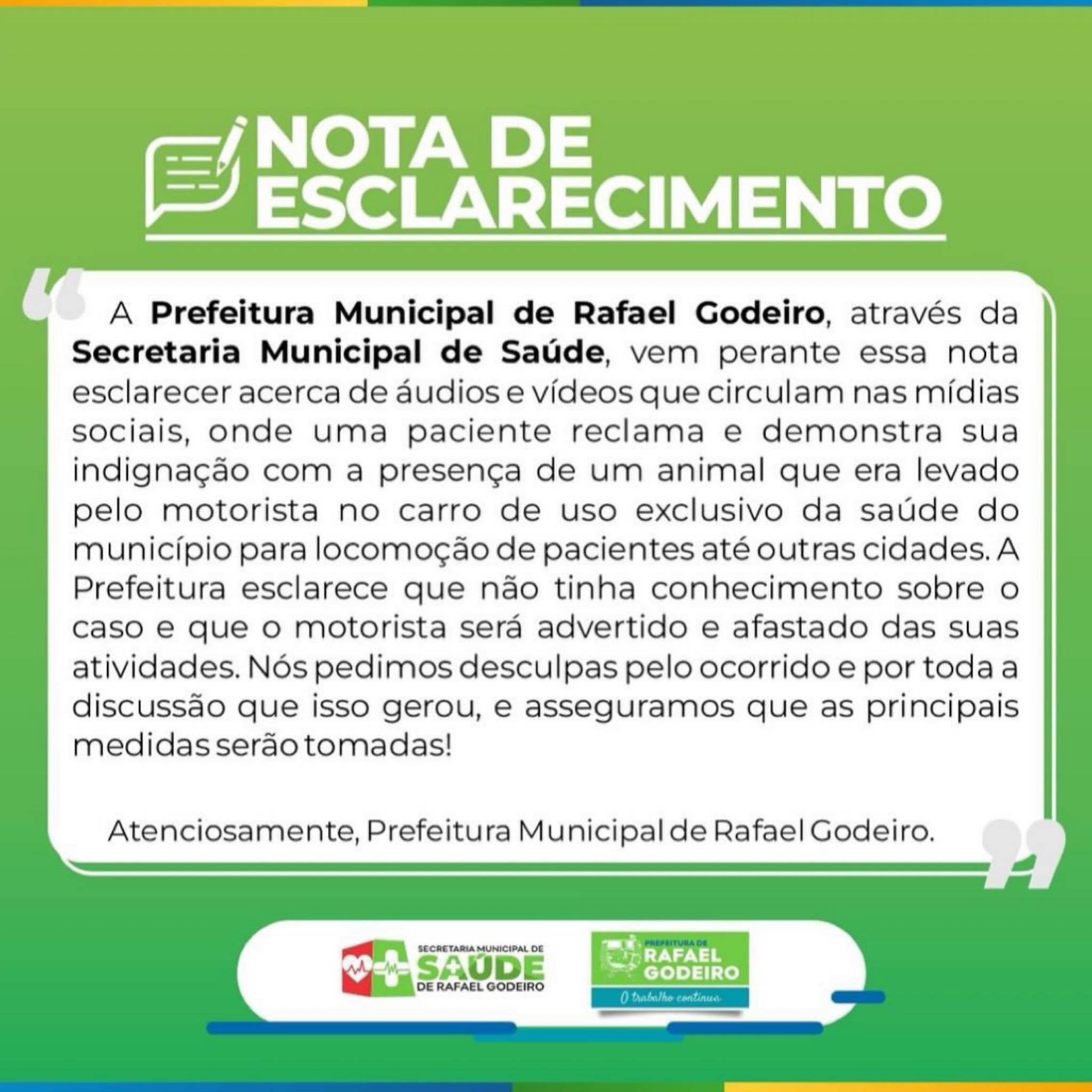 A Prefeitura de Rafael Godeiro, na região Oeste potiguar, afastou um motorista que levou um cachorro, no carro exclusivo da saúde, em uma viagem com pacientes. O caso ganhou repercussão por áudios divulgados por uma das passageiras que criticou a locomoção de pessoas que iriam fazer hemodiálise junto com o animal.