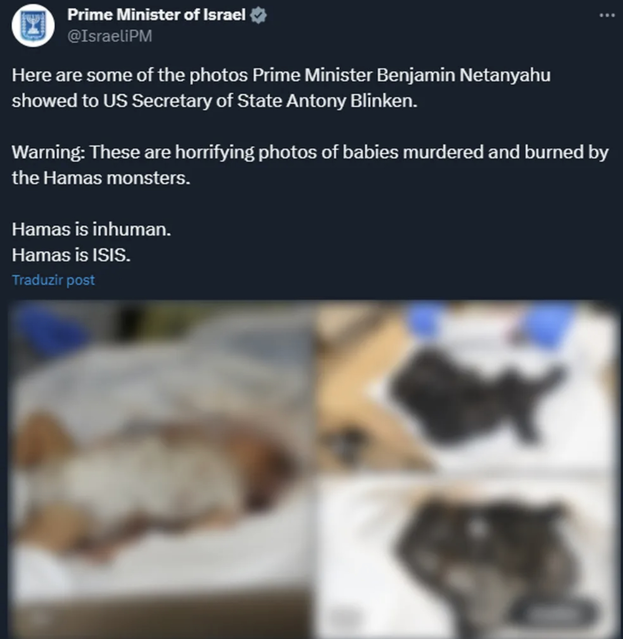 O post diz: “Aqui estão algumas das fotos que o primeiro-ministro Benjamin Netanyahu mostrou ao secretário de Estado dos EUA, Antony Blinken. Aviso: Estas são fotos horríveis de bebês assassinados e queimados pelos monstros do Hamas”, diz a postagem. “O Hamas é desumano. Hamas é ISIS [Estado Islâmico].”