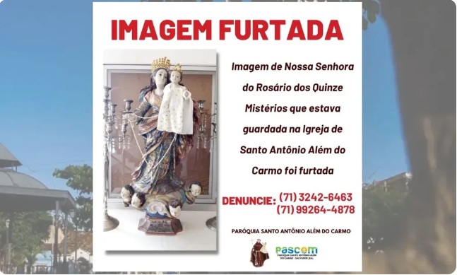 A imagem de Nossa Senhora do Rosário dos Quinze Mistérios, do século 19, que estava guardada na Igreja do Santo Antônio Além do Carmo, em Salvador, foi roubada do local onde estava guardada.
