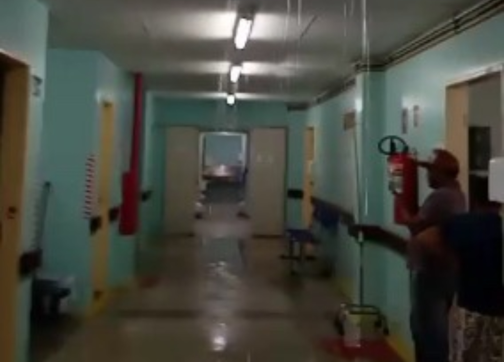 “Aqui a situação do Walfredo agora de tarde, como é que está. Estourou um cano lá por cima, não sei por onde, e haja água por tudo quanto é canto. Nos corredores, na enfermaria…”, diz um dos funcionários que está filmando o momento.