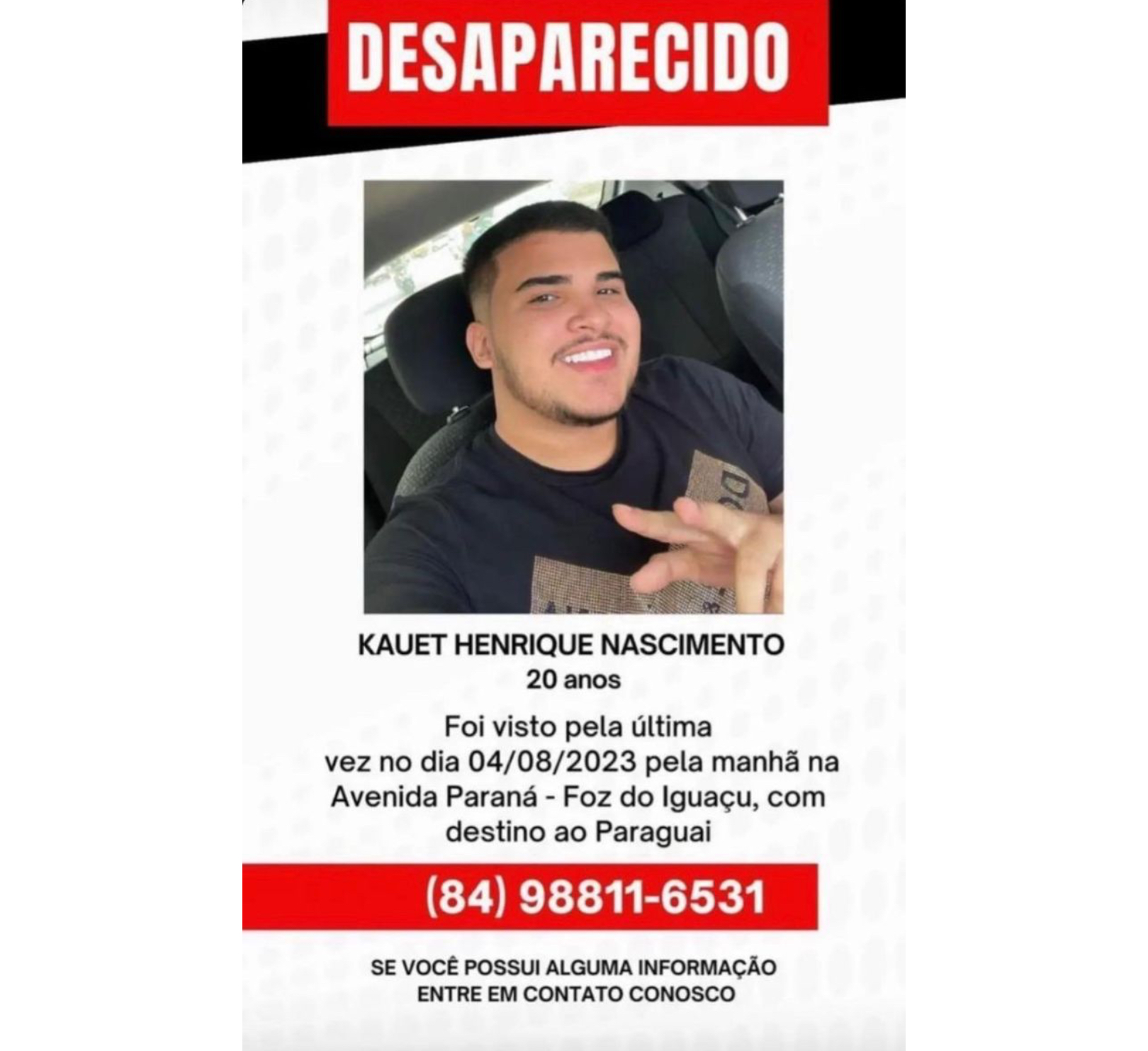 Infelizmente, o potiguar Kauet Henrique Nascimento, de 20 anos, que estava desaparecido desde a última sexta-feira (4), quando partiu para uma viagem para o Paraguai foi encontrado sem vida.