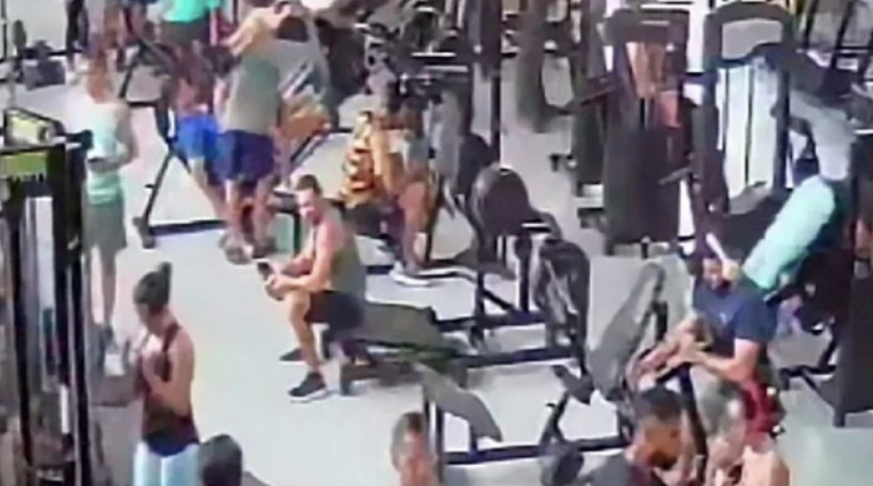As cenas registradas pelas câmeras do local mostram o instante em que a máquina de agachamento se desprende sobre o homem, que estava sentado na base do aparelho, e pessoas ao redor se apressam para ajudar a erguer a parte sobre suas costas.
