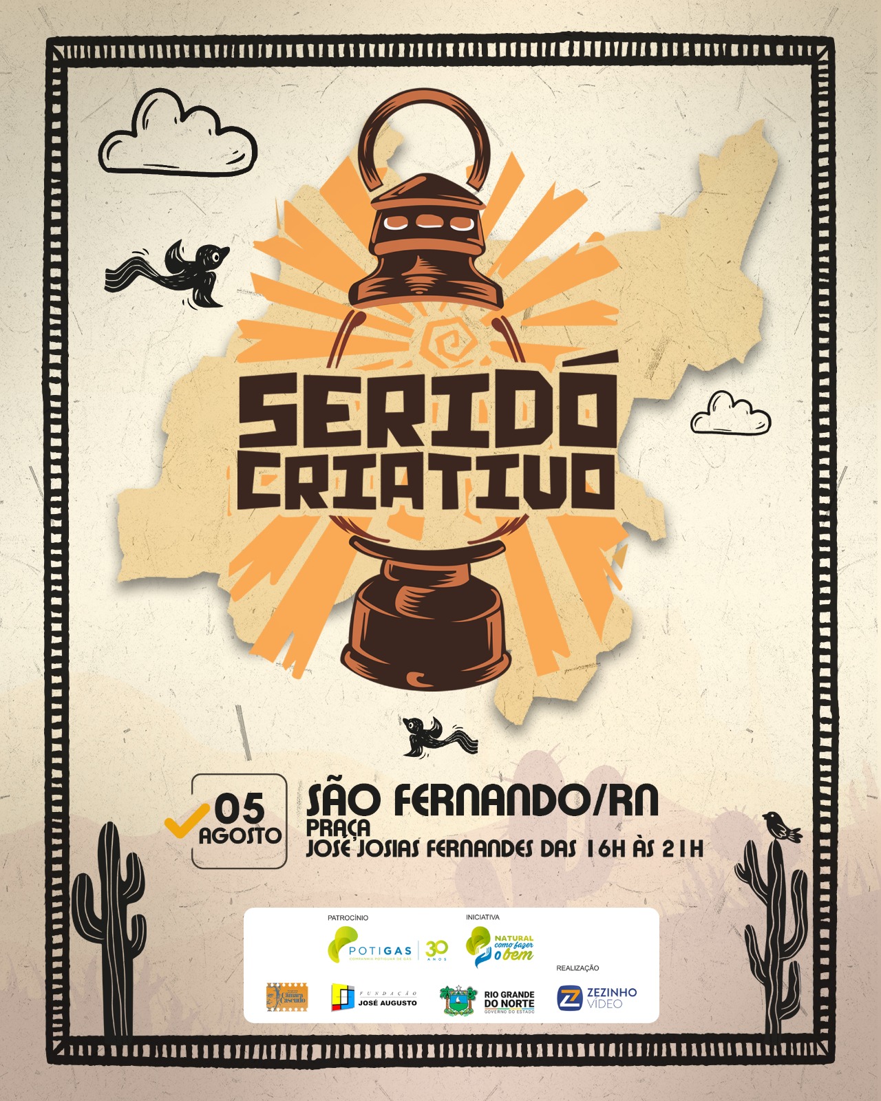 Neste sábado, dia 05, São Fernando recebe o Projeto Seridó Criativo, que visita sete cidades do Seridó apresentando uma programação artística e cultural, totalmente gratuita, favorecendo a economia criativa, através da exposição e comercialização de artes e artesanato.